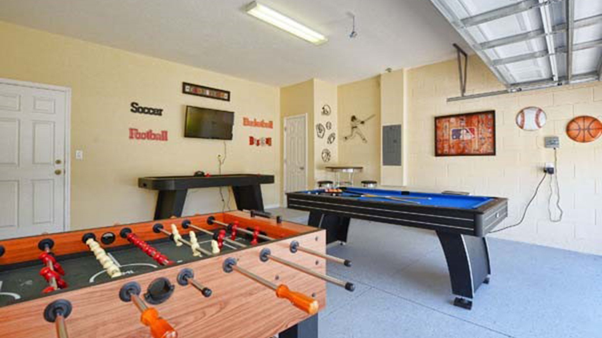 Opposite the master suite is a guest WC and entry to the garage which houses a fully equipped games rooms with table tennis, pool table and table football.