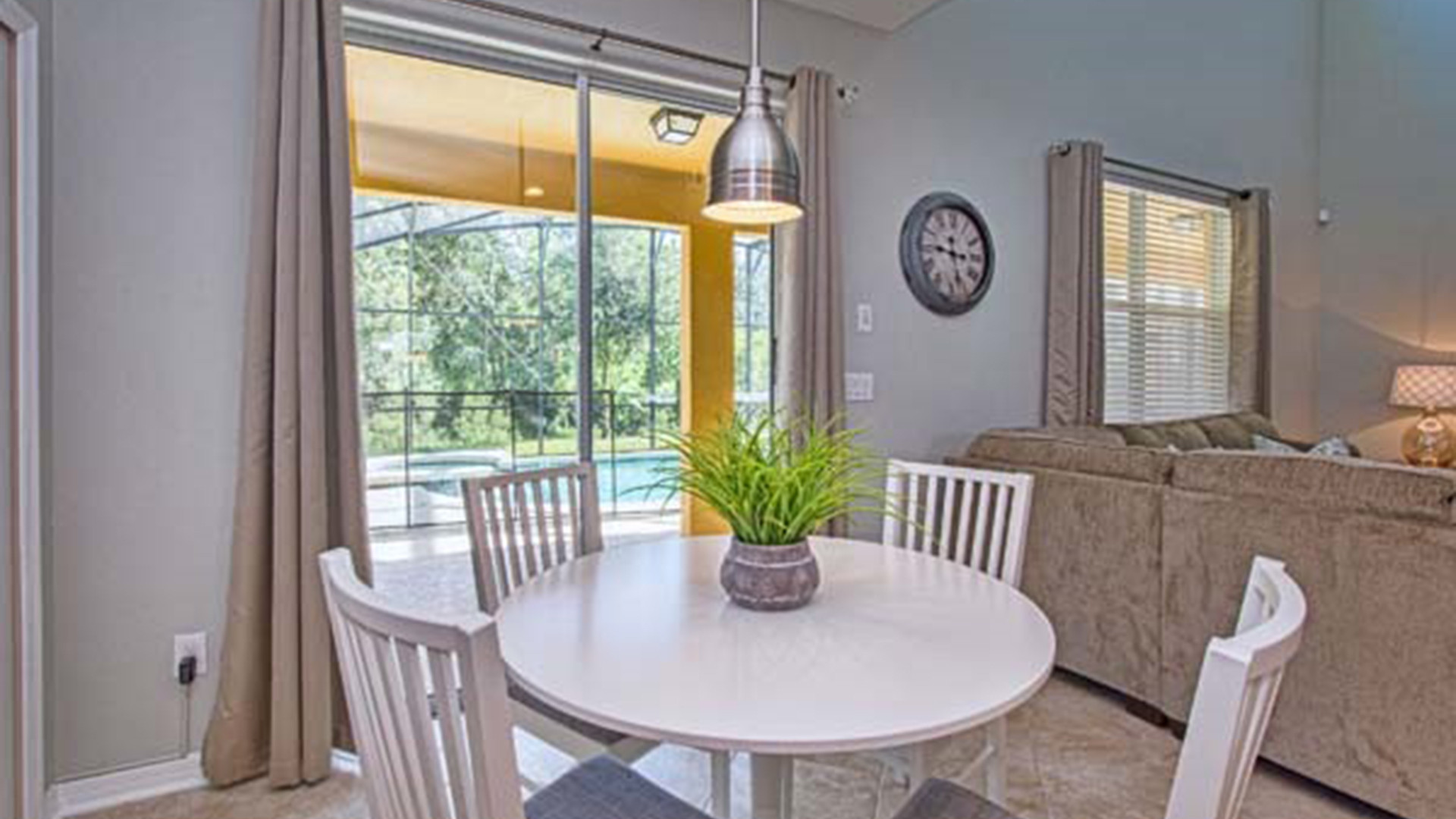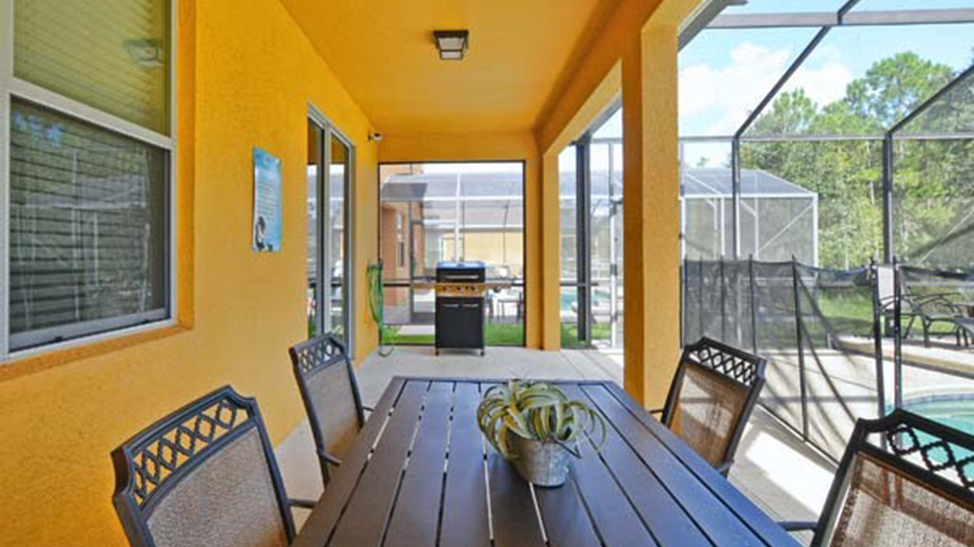 The pool deck has a child safety fence to give you peace of mind during your stay. There are four sun loungers to recline on and an outside dining table. The pool is covered with a lanai and can also be heated at extra cost, so guests can use this all year round.
