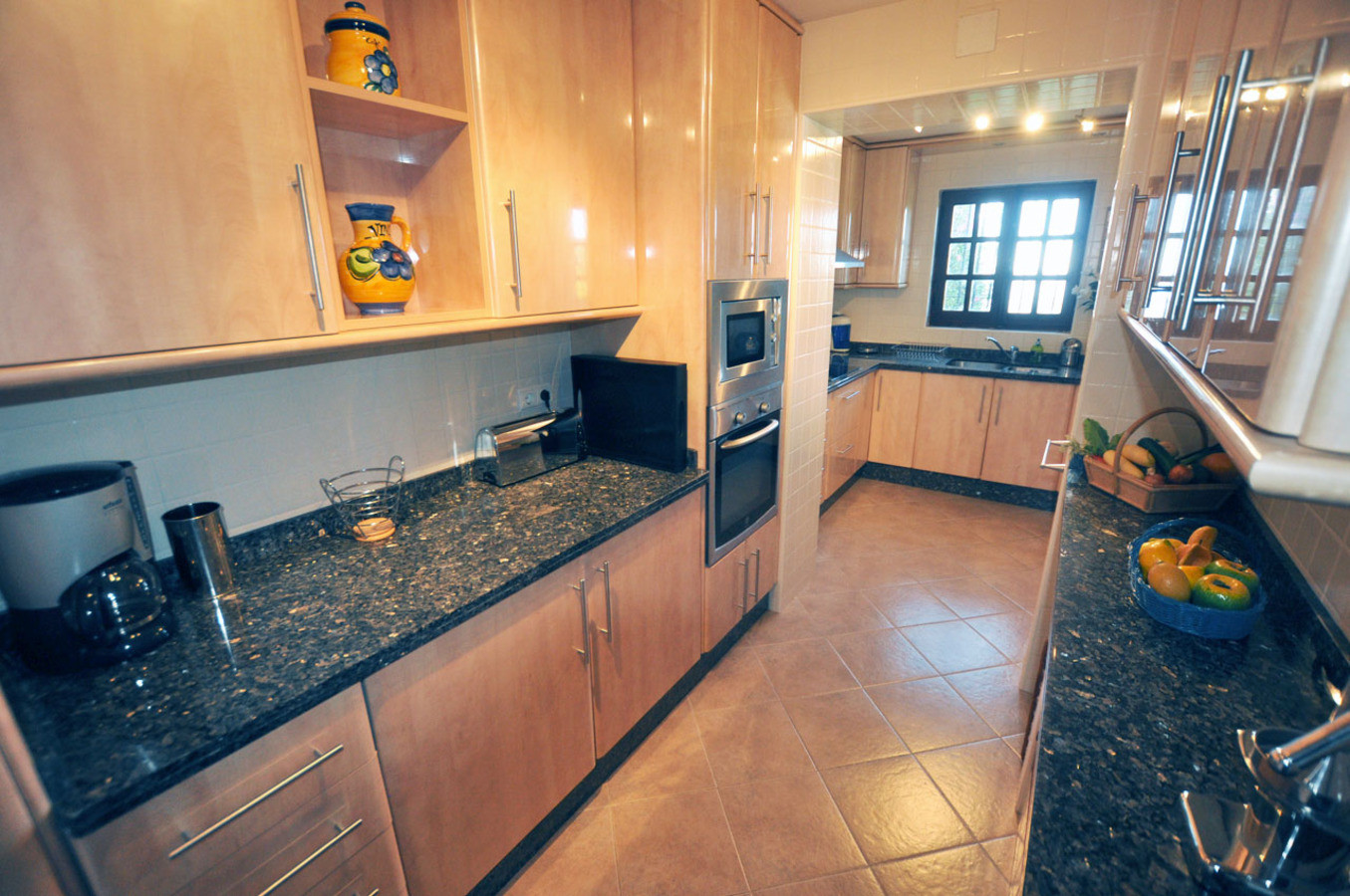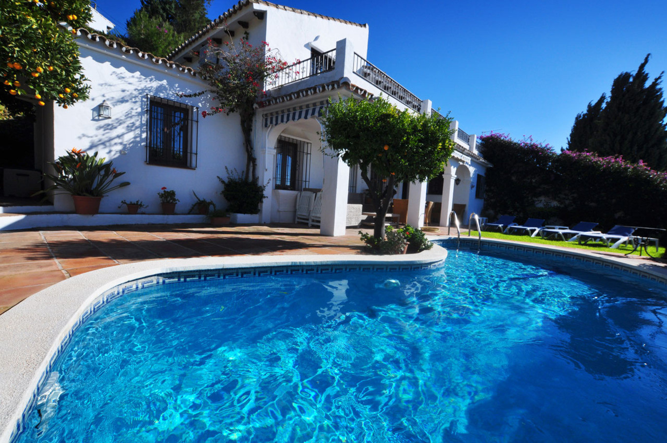 Outside, the villa is just as attractive with well kept gardens and mature trees. You can even pick your own delicious juicy oranges from the trees. The kidney shaped pool is 9m long and can be heated in cooler months (optional). On the terrace there is a traditional charcoal BBQ and plenty of space to sit and dine or just soak up the sun.