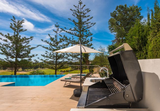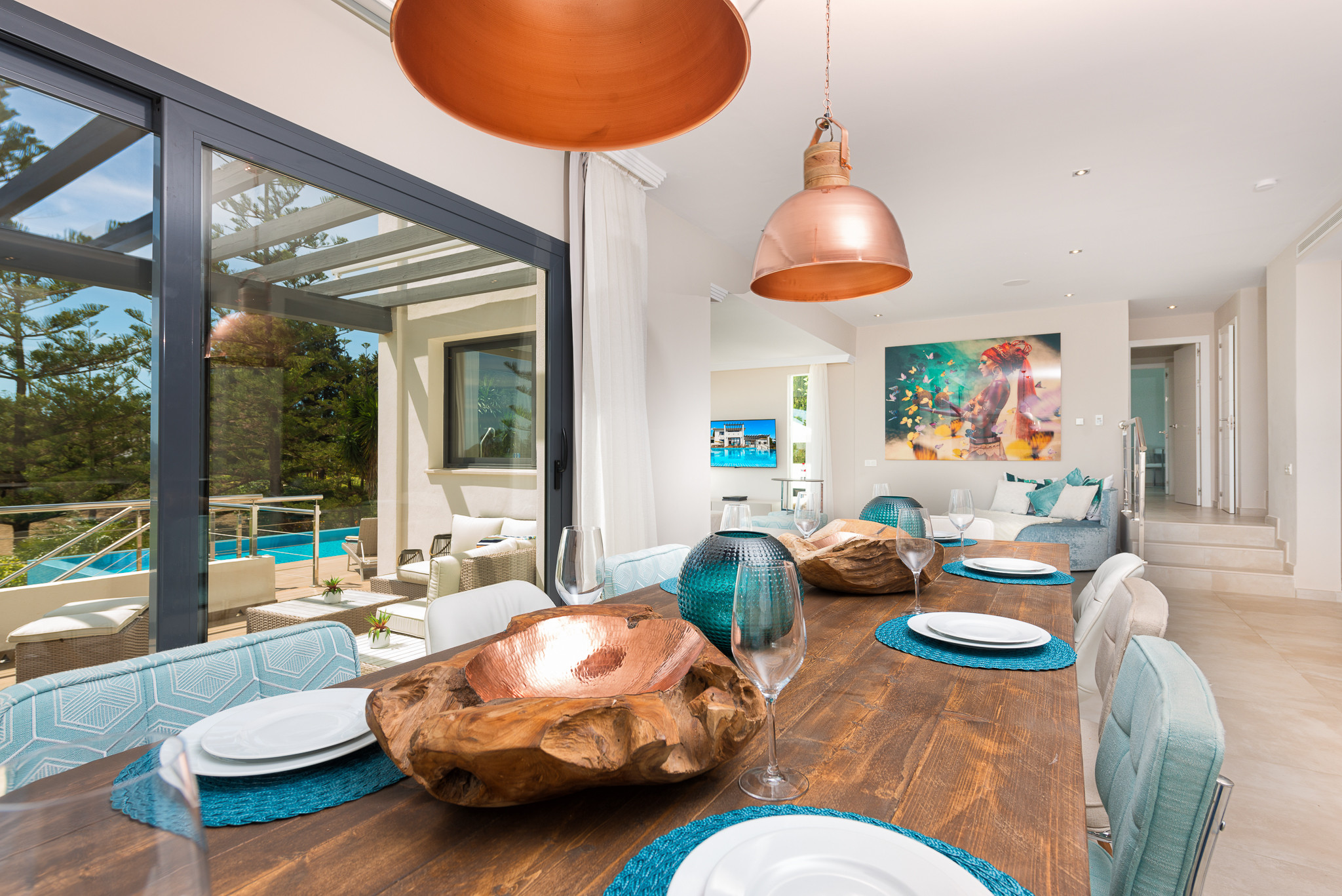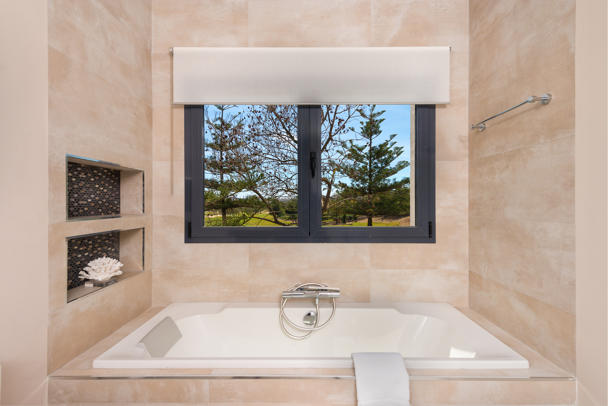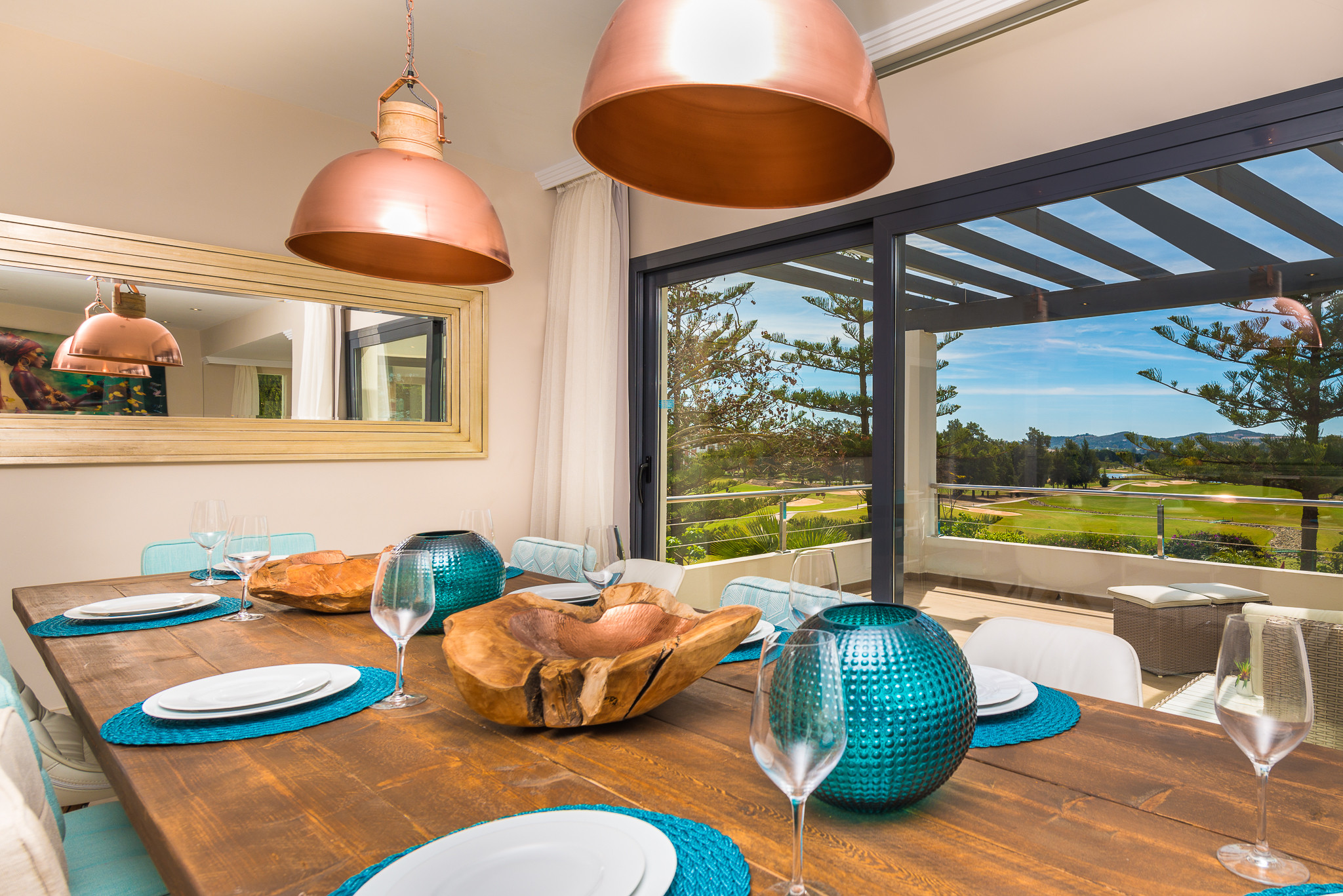 Open plan living is the theme throughout with the lounge, dining area and kitchen on the ground floor. Comfortable seating and tasteful soft furnishings allow guests to relax, watch TV on the 54 inch screen, or just enjoy the panoramic views of the gardens, pool and golf course. The villa benefits for underfloor heating in cooler months.