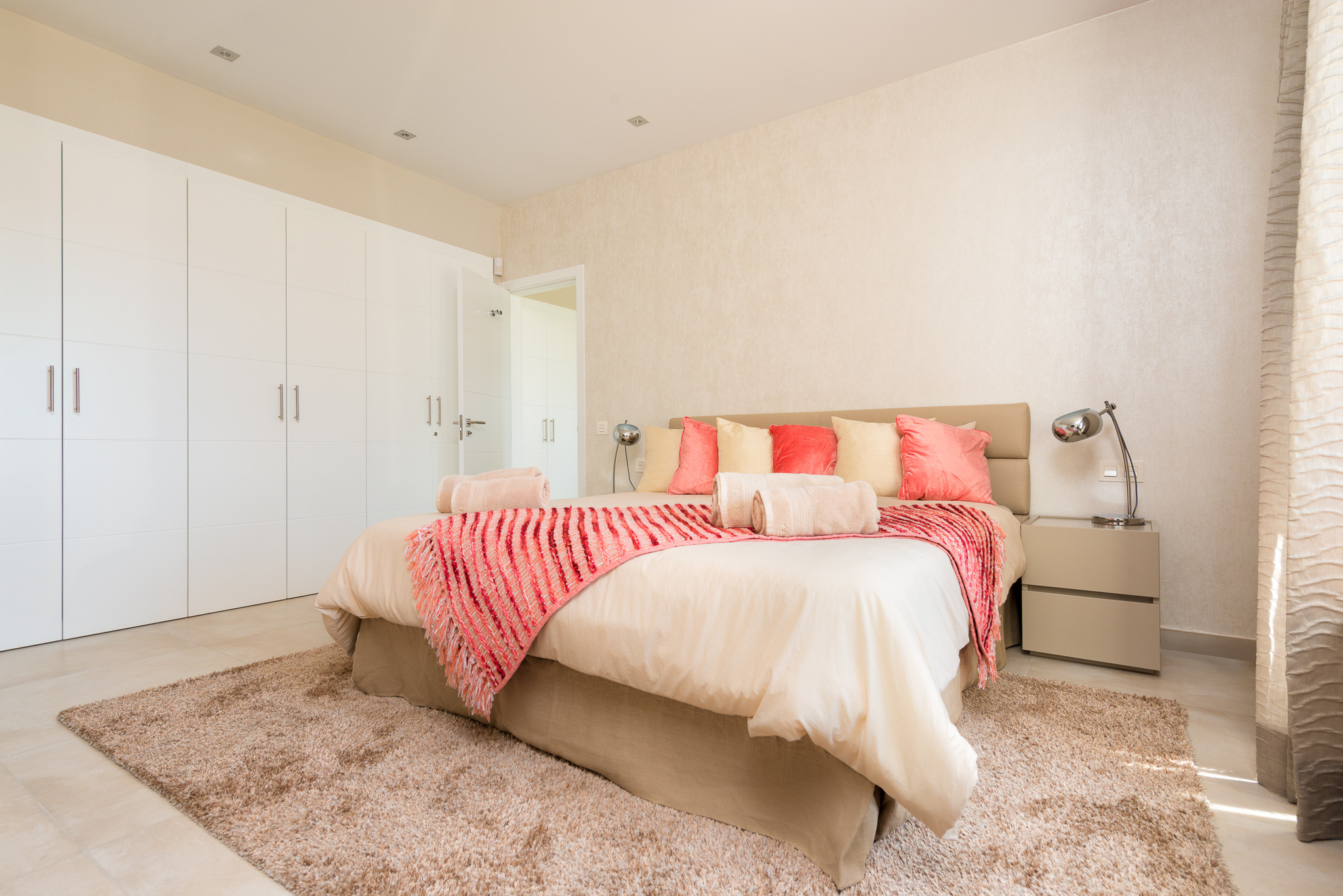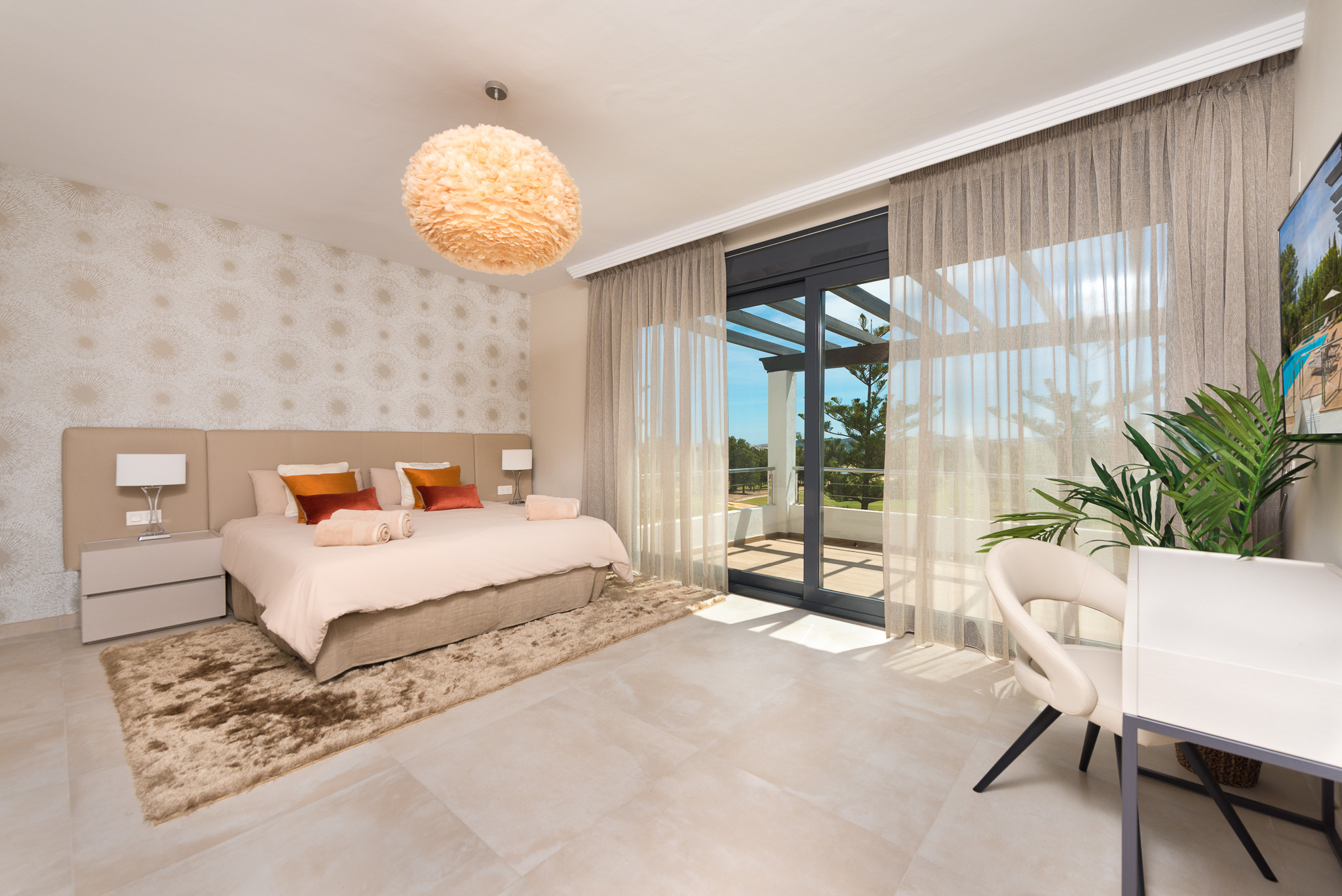 On the upper floor there are three further bedrooms. The second master bedroom has a super king size bed, fitted wardrobes, a safe, a 48 inch TV, and a luxurious en-suite bathroom with shower, WC and double hand basins. This room also has its own private balcony.