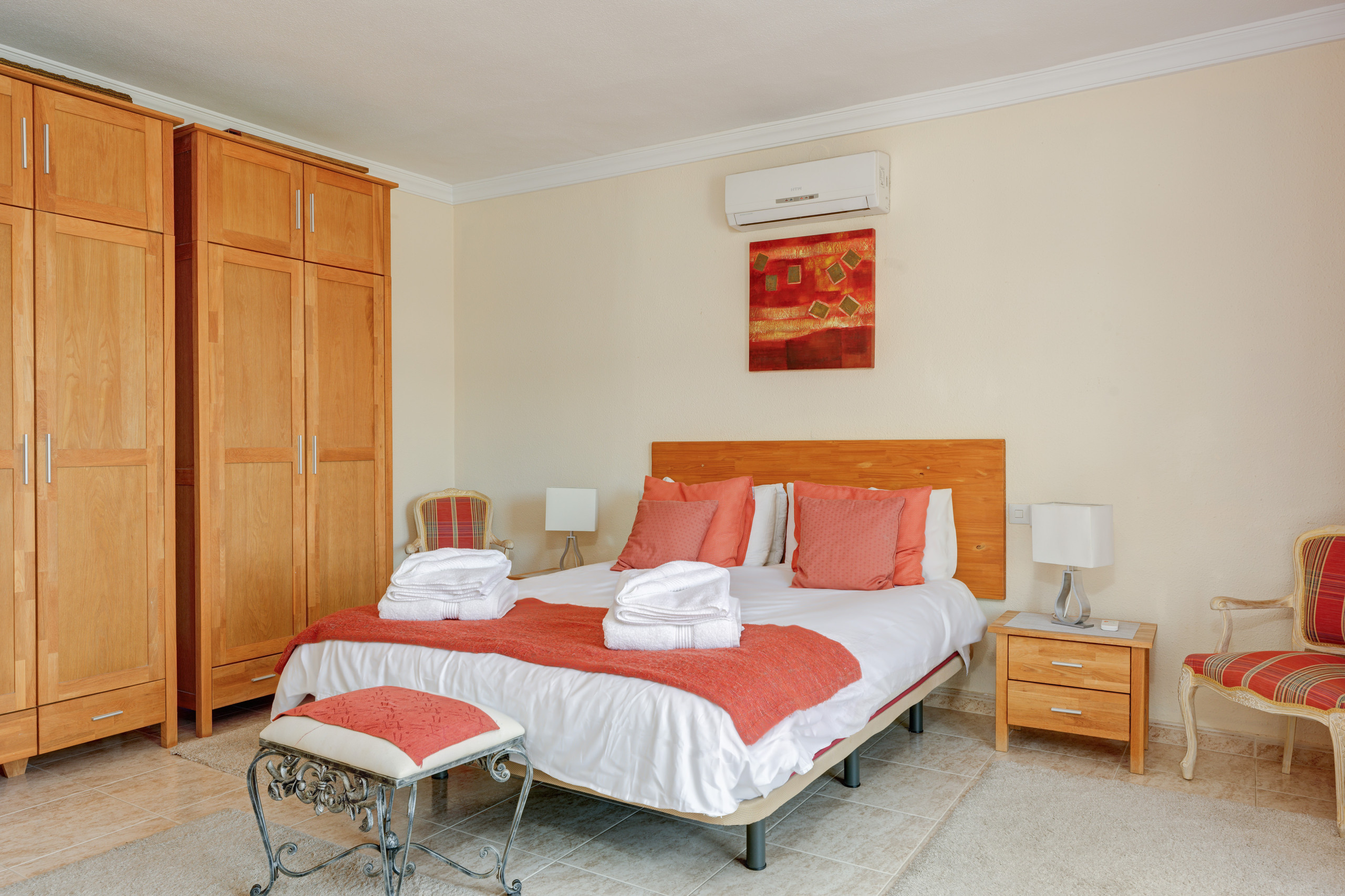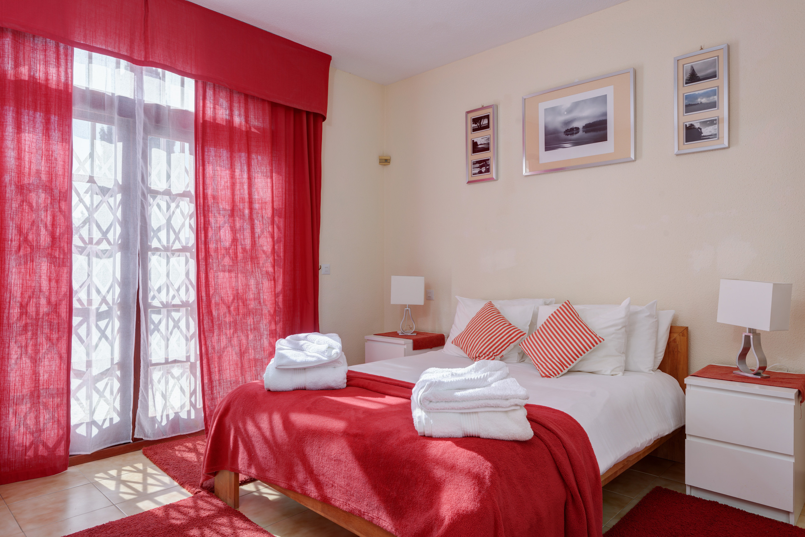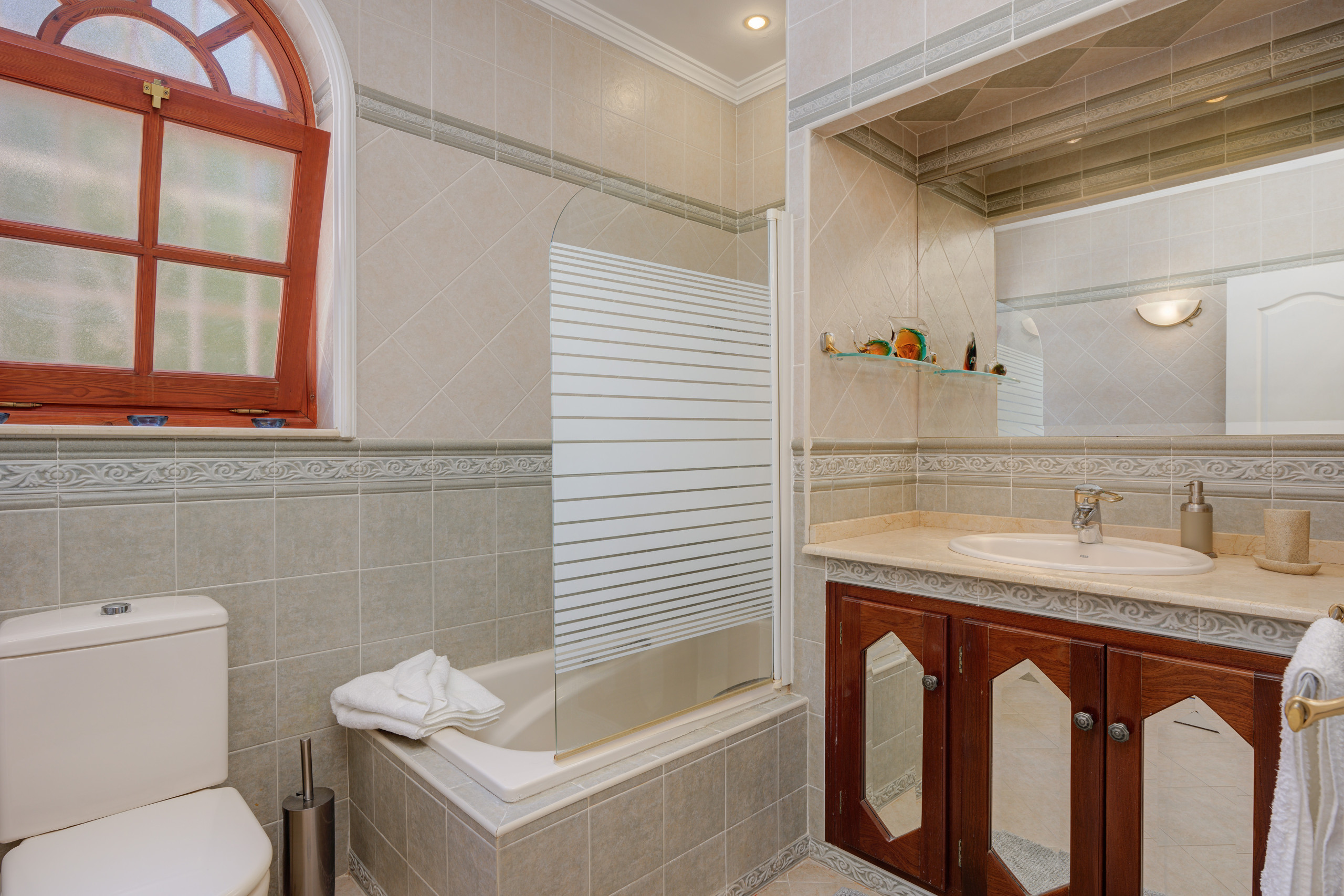 The large master bedroom has terrace access and a beautiful en-suite bathroom with corner bath and walk-in shower. Bedroom 2 is also a double room with doors onto the terrace and plenty of storage space. Both double bedrooms have TVs. Bedroom 3 is a twin room.