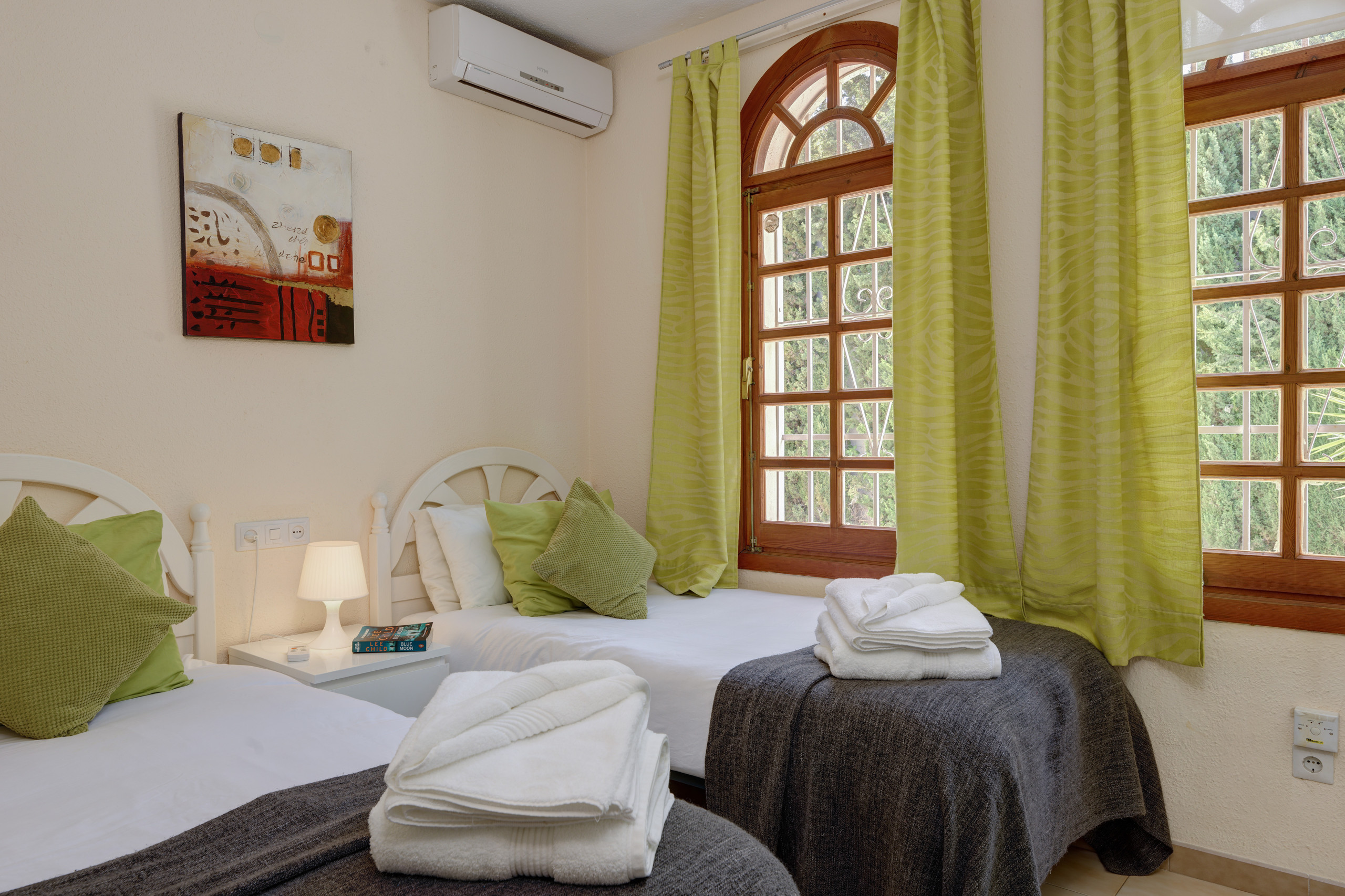 The two air conditioned sleeps on the first floor have separate balconies and double beds (one can be seperated). They share one bathroom with double washbasins, shower, wc and bidét.