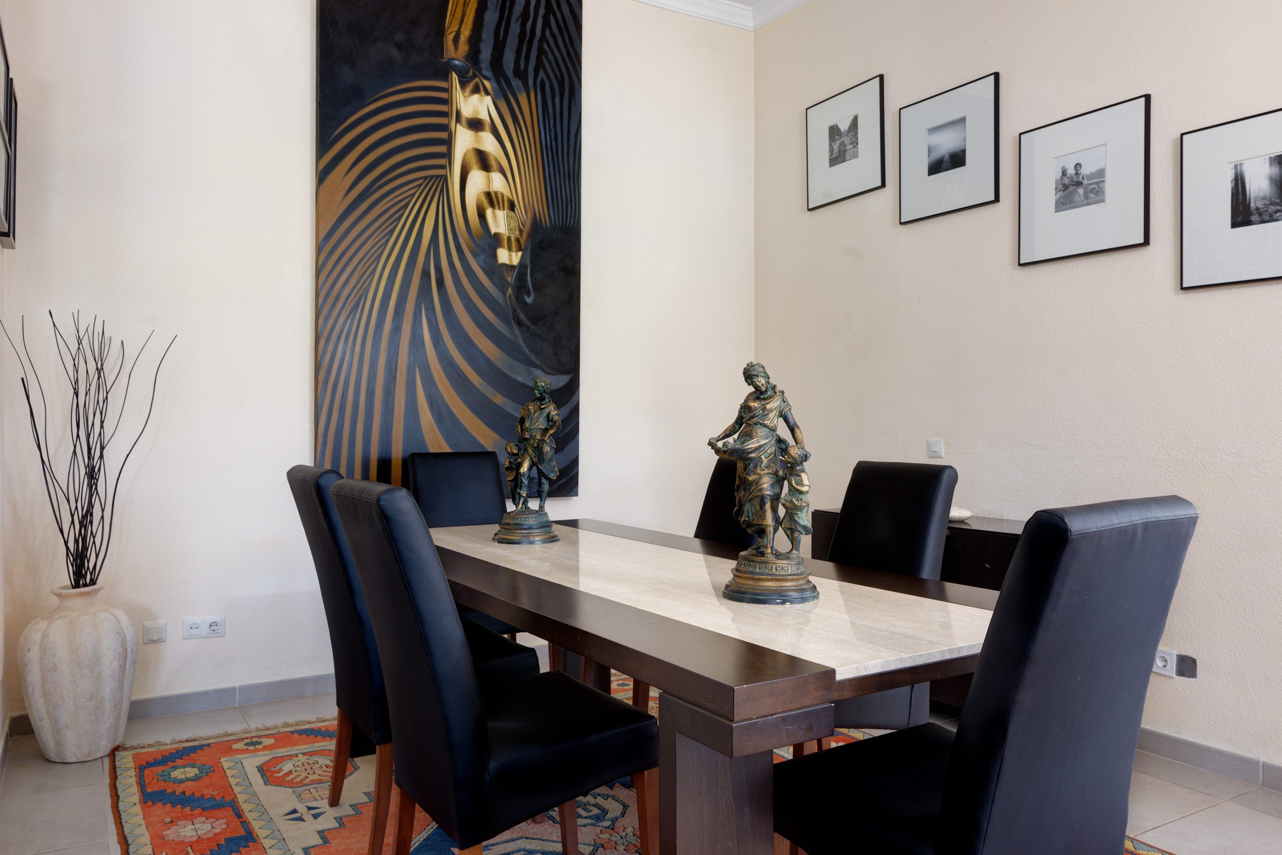This Mijas Golf villa offers well-proportioned and well-furnished living space for up to 6 guests. The living room has 3 comfortable sofas and French doors that open out onto the terrace. There is a TV with satellite channels and WiFi internet. The whole house is air conditioned at no extra cost so you can stay cool, whatever the weather. There is a lovely dining room with formal dining table and chairs to seat 6.