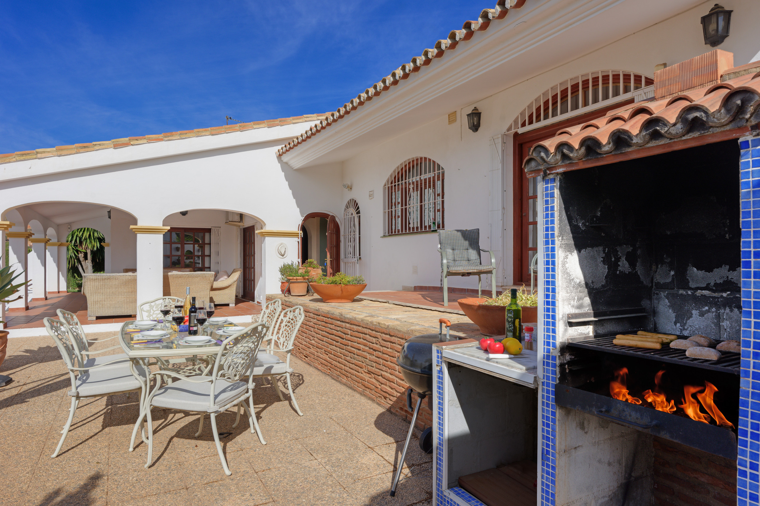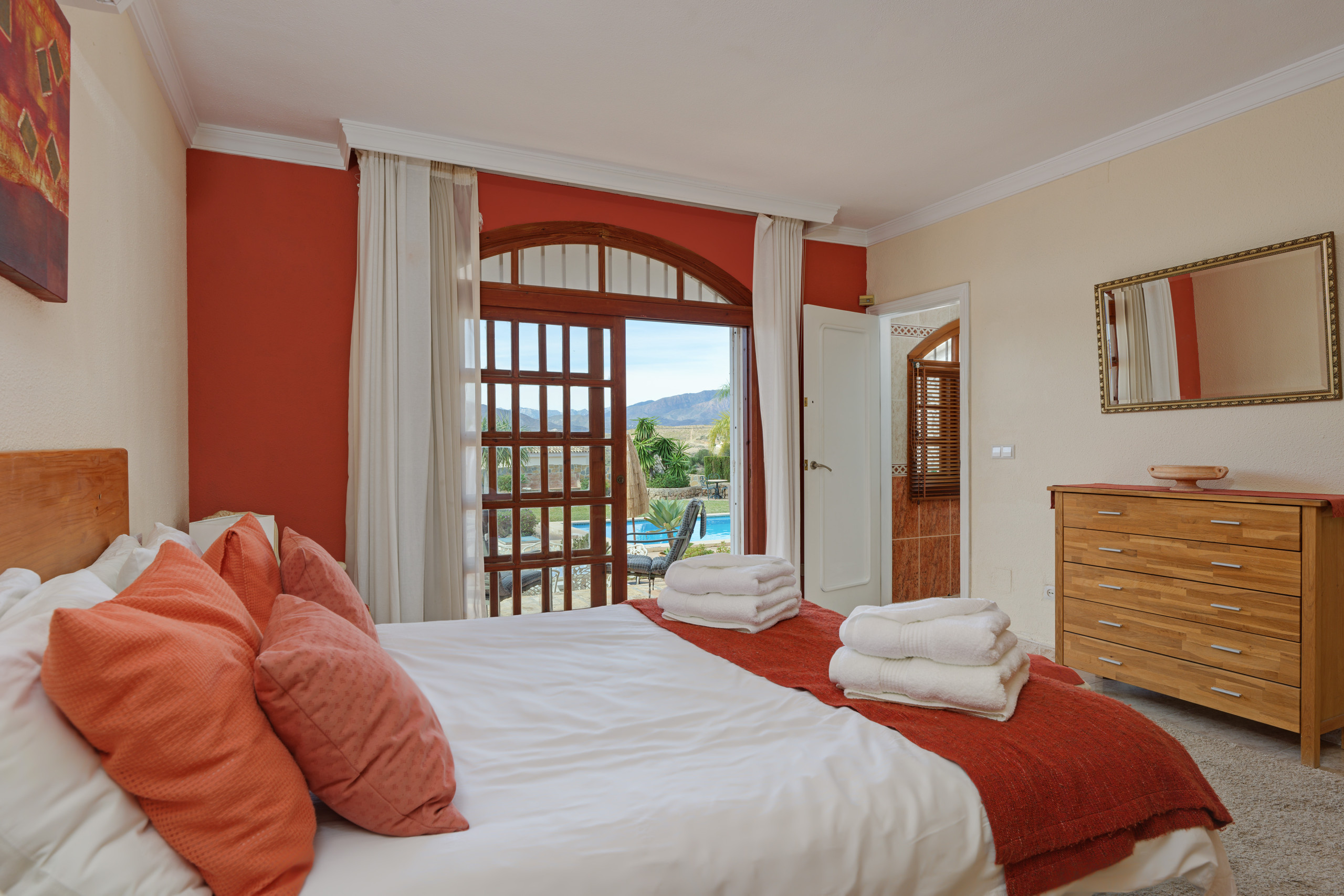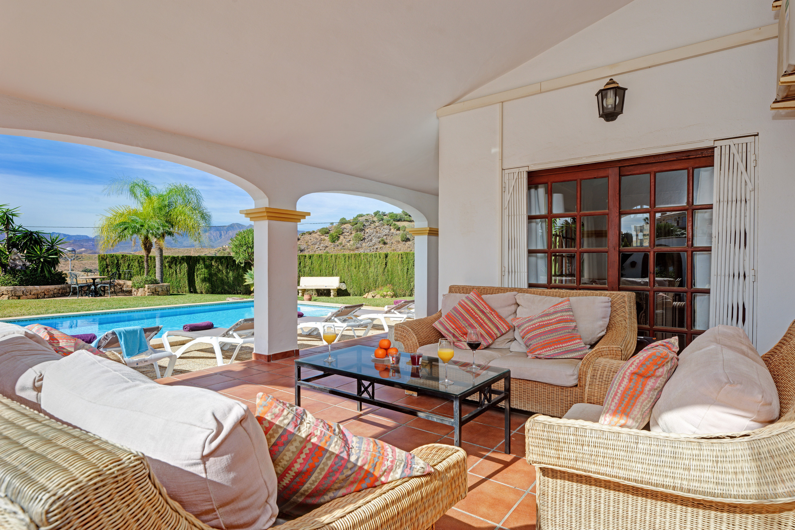 The kitchen in the villa is traditional Andalusian in style, but it is fitted with all mod cons. There is a breakfast table with seating in the kitchen, and a lovely dining room with seating for 8 and double doors out to the terrace. On the terrace there are more tables; some under a sheltered roof to provide shade if preferred. This is a lovely spot to sit and enjoy the beautiful view.