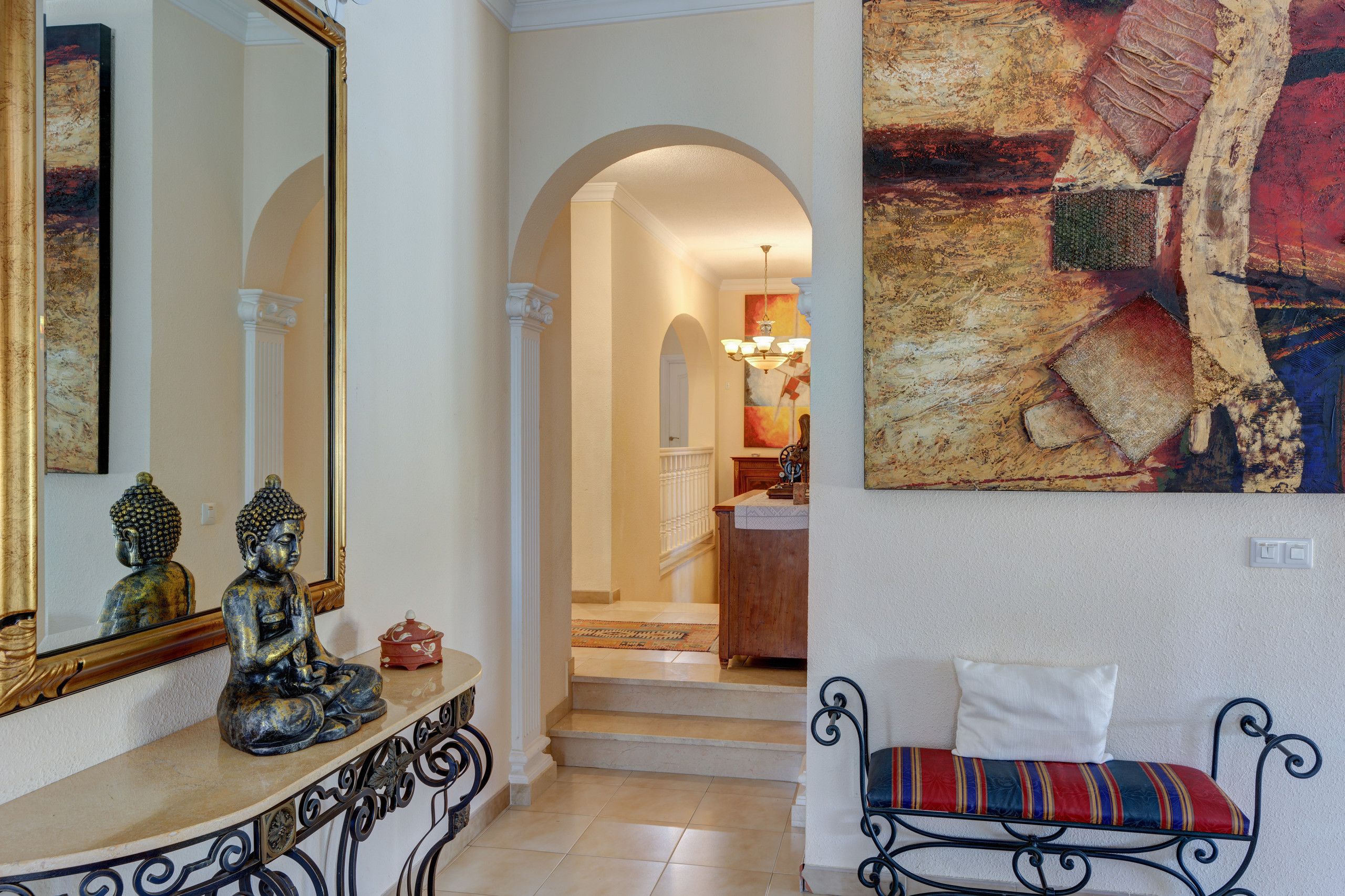 This spacious, single level villa is located on the Mijas Golf Urbanisation, just a 10 minute drive from Fuengirola and La Cala de Mijas. There are two 18 hole courses right on your doorstep at the Mijas Golf Club so this is a perfect spot for keen golfers. For those that prefer to relax by the pool this villa has large terrace furnished with outdoor sofas, table and chairs and plenty of poolside loungers.