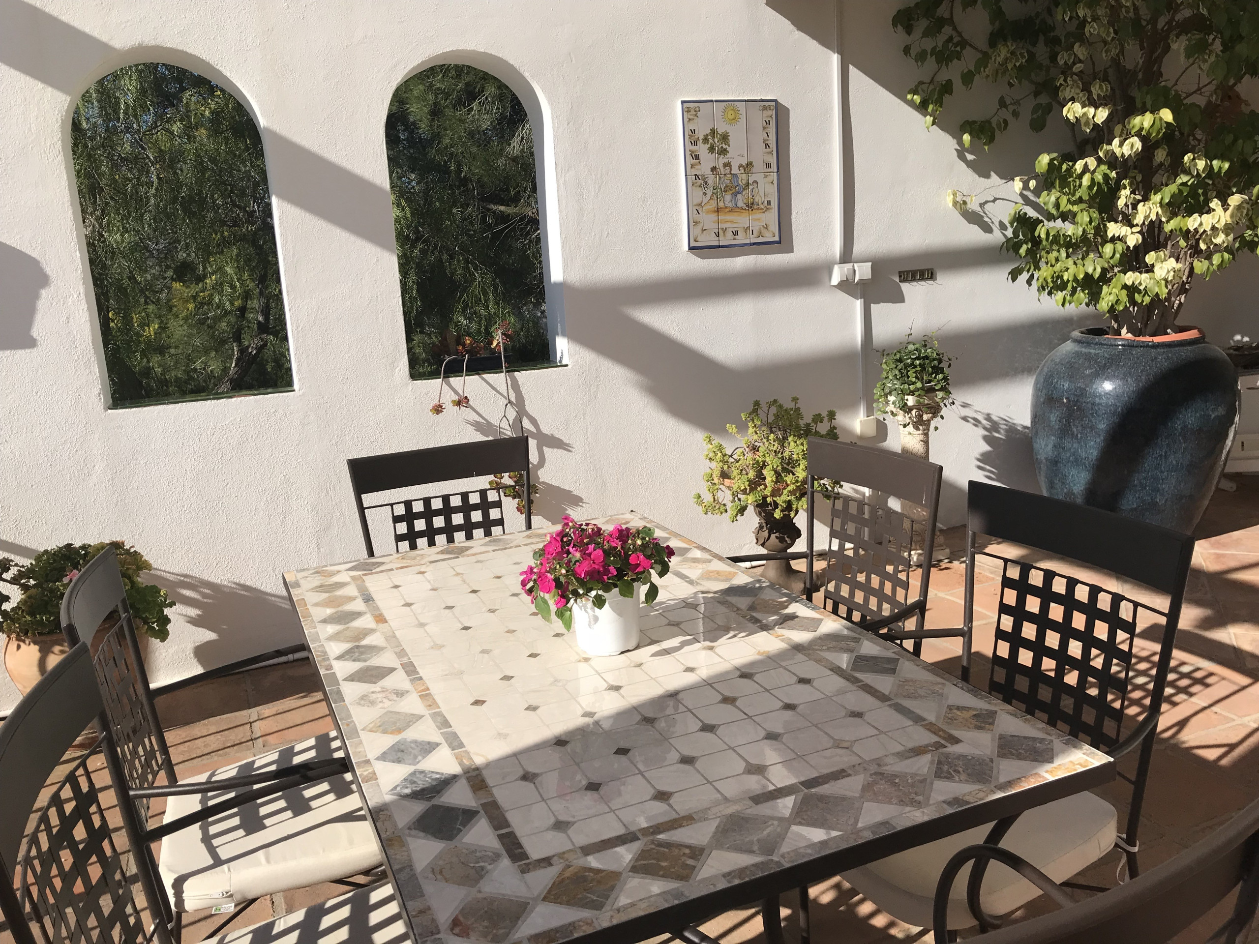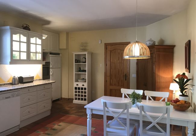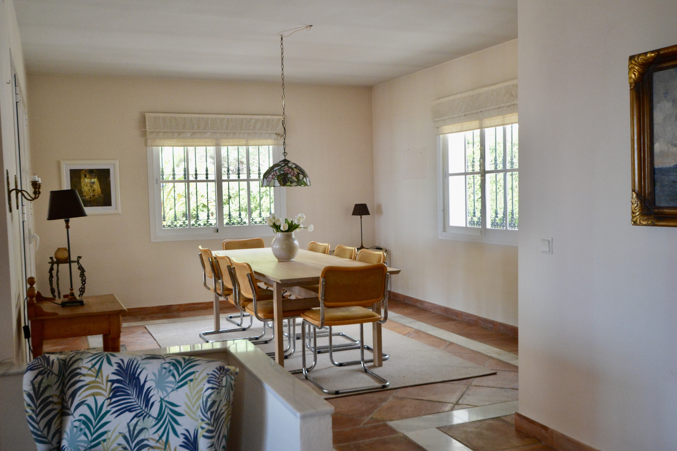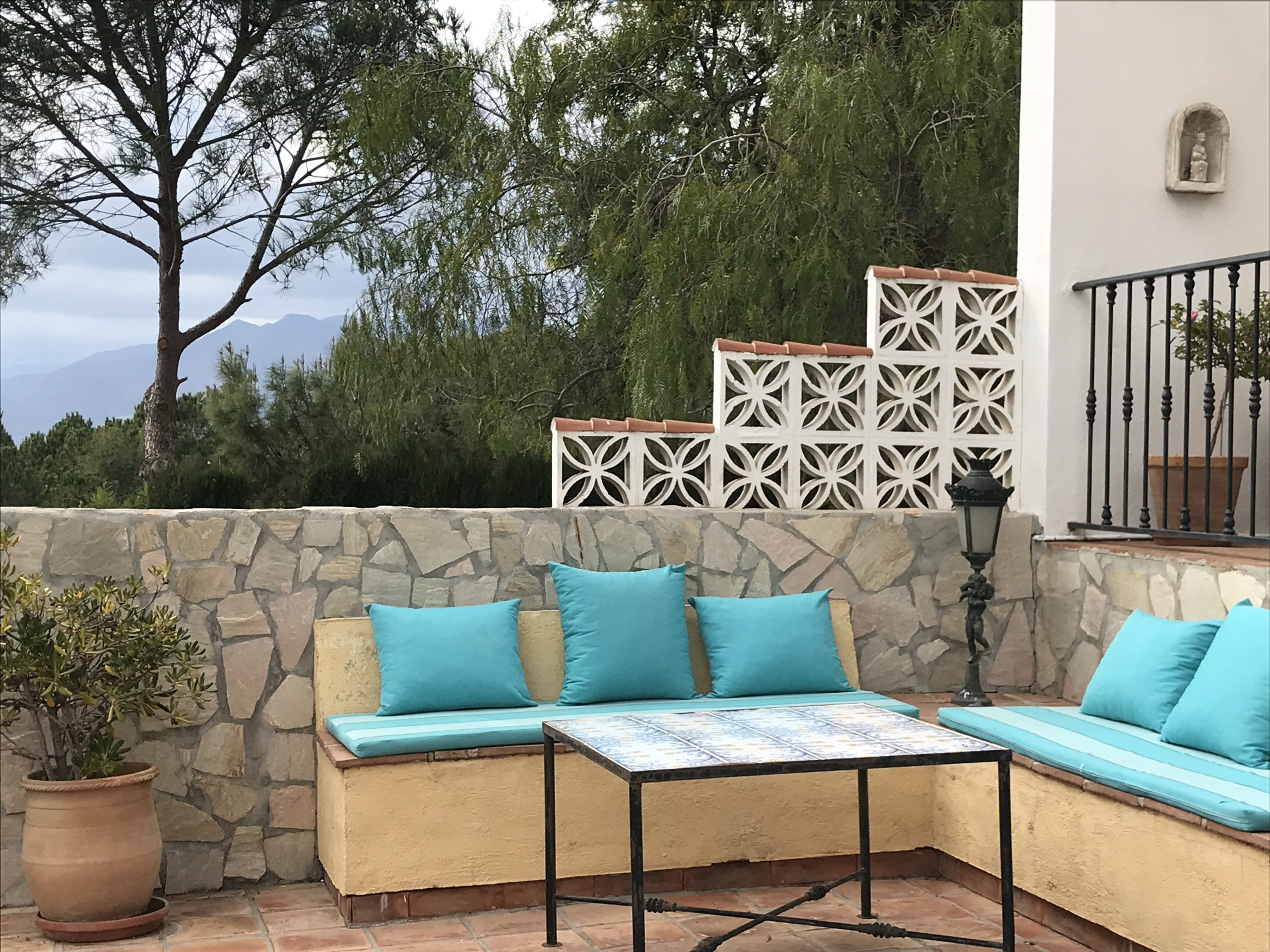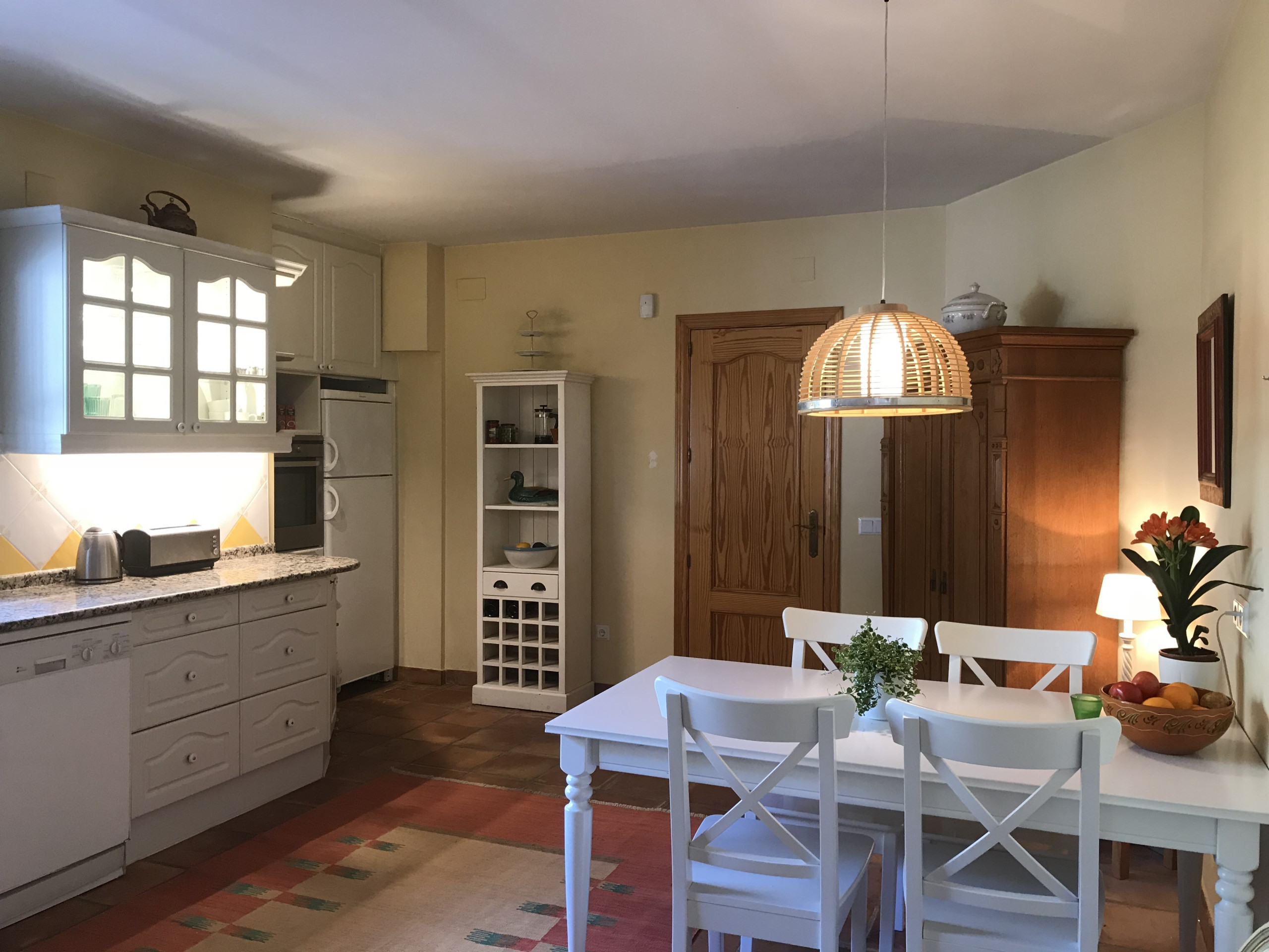 The kitchen in the villa is traditional Andalusian in style, but it is fitted with all mod cons. There is a breakfast table with seating in the kitchen, and a lovely dining room with seating for 8 and double doors out to the terrace. On the terrace there are more tables; some under a sheltered roof to provide shade if preferred. This is a lovely spot to sit and enjoy the beautiful view.