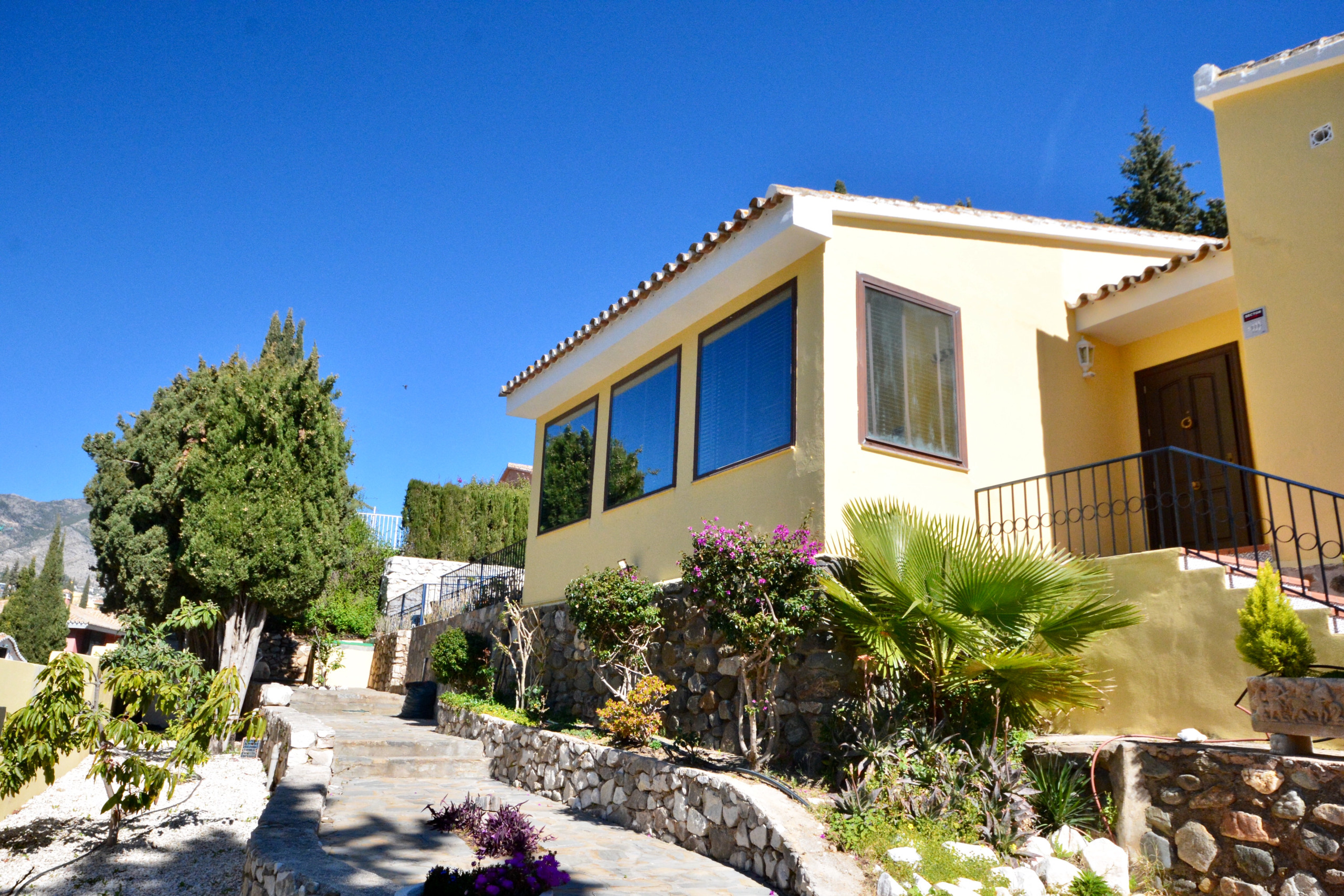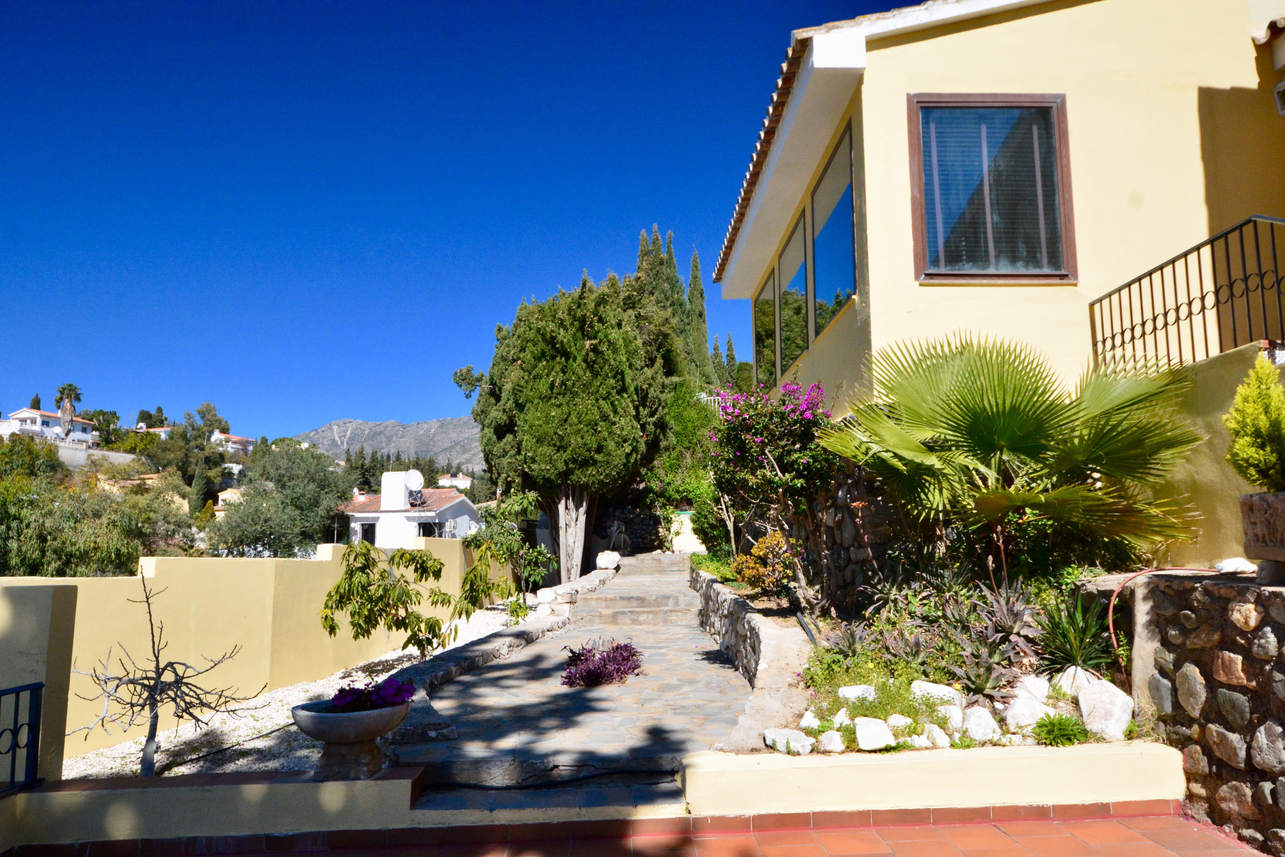Set in a large plot, this location is truly special with a grand view of the Mediterranian Sea. Sheltered surroundings and a lush garden overlooking Fuengirola, the see and the Mijas mountains (with excellent hiking opportunities).