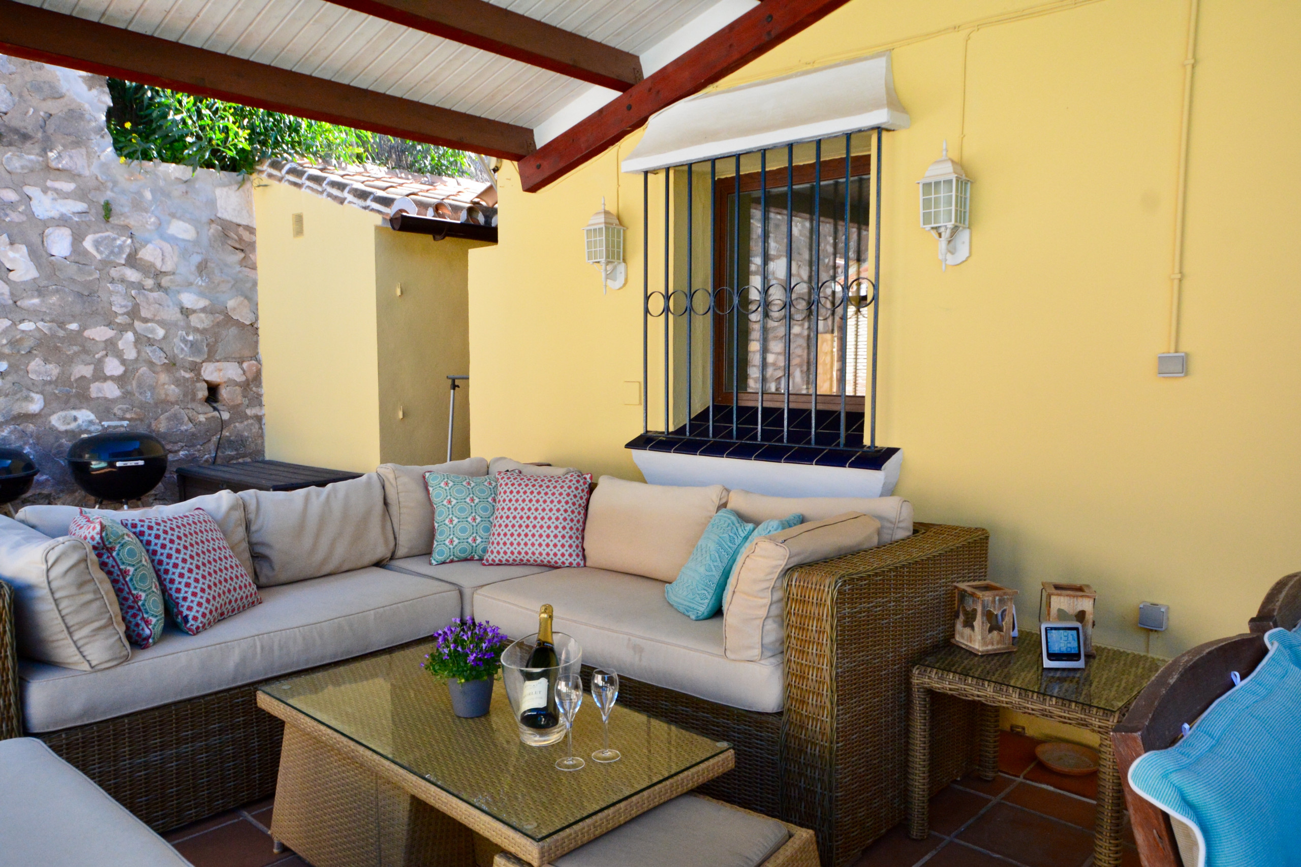 Outside the villa has a terrific covered terrace/outside living room with comfortable sofa seating. For those that like to dine al fresco there is a BBQ and table seating for 6. There are also sun loungers by the poolside. The private pool is accessed via steps in the shallow end. There is also a lawned area that is great for energetic kids to run around on!