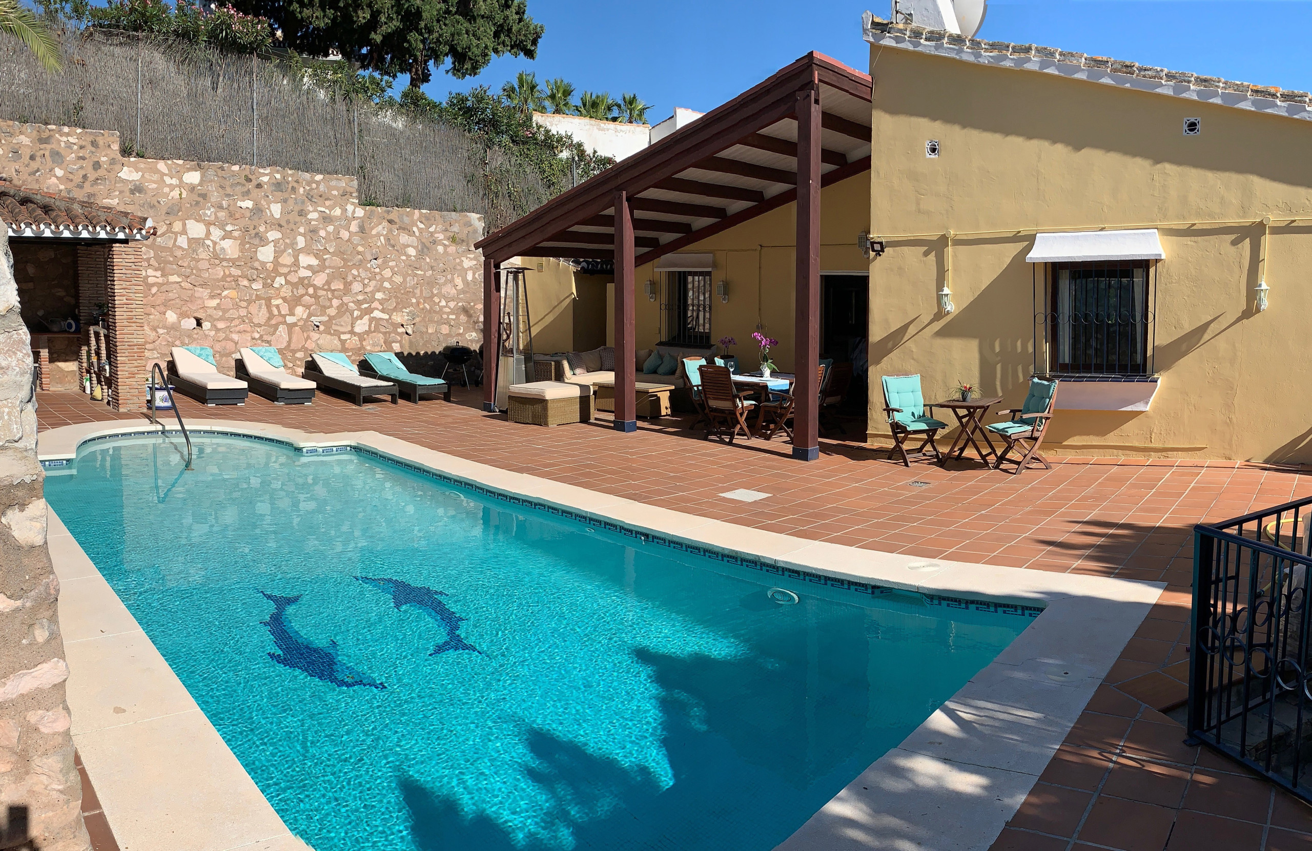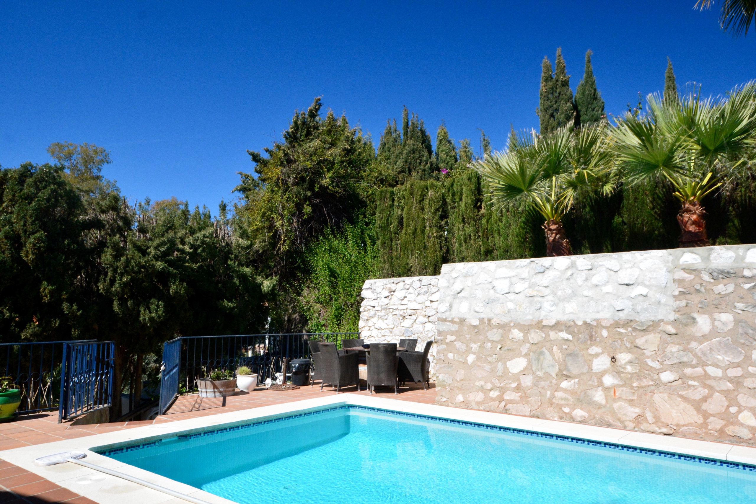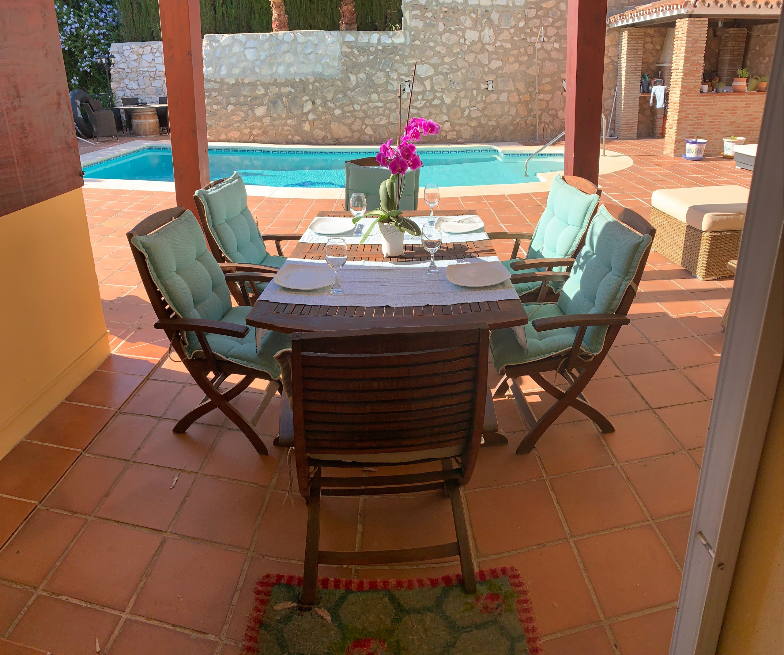 The kitchen in the villa is traditional Andalusian in style, but it is fitted with all mod cons. There is a breakfast table with seating in the kitchen, and a lovely dining room with seating for 8 and double doors out to the terrace. On the terrace there are more tables; some under a sheltered roof to provide shade if preferred. This is a lovely spot to sit and enjoy the beautiful view.