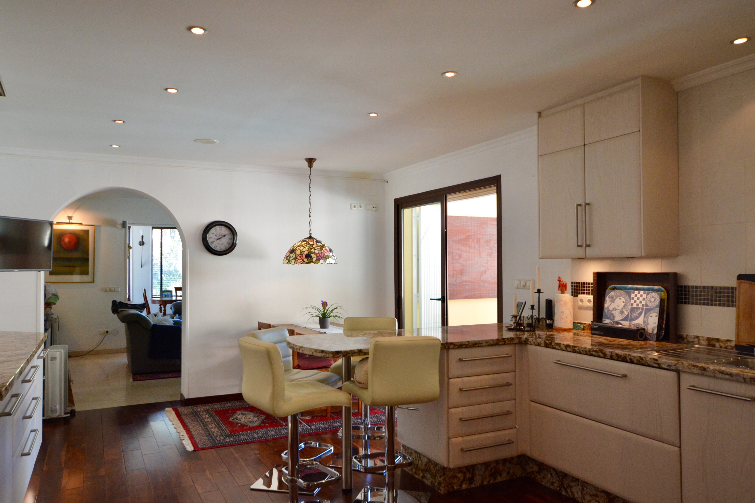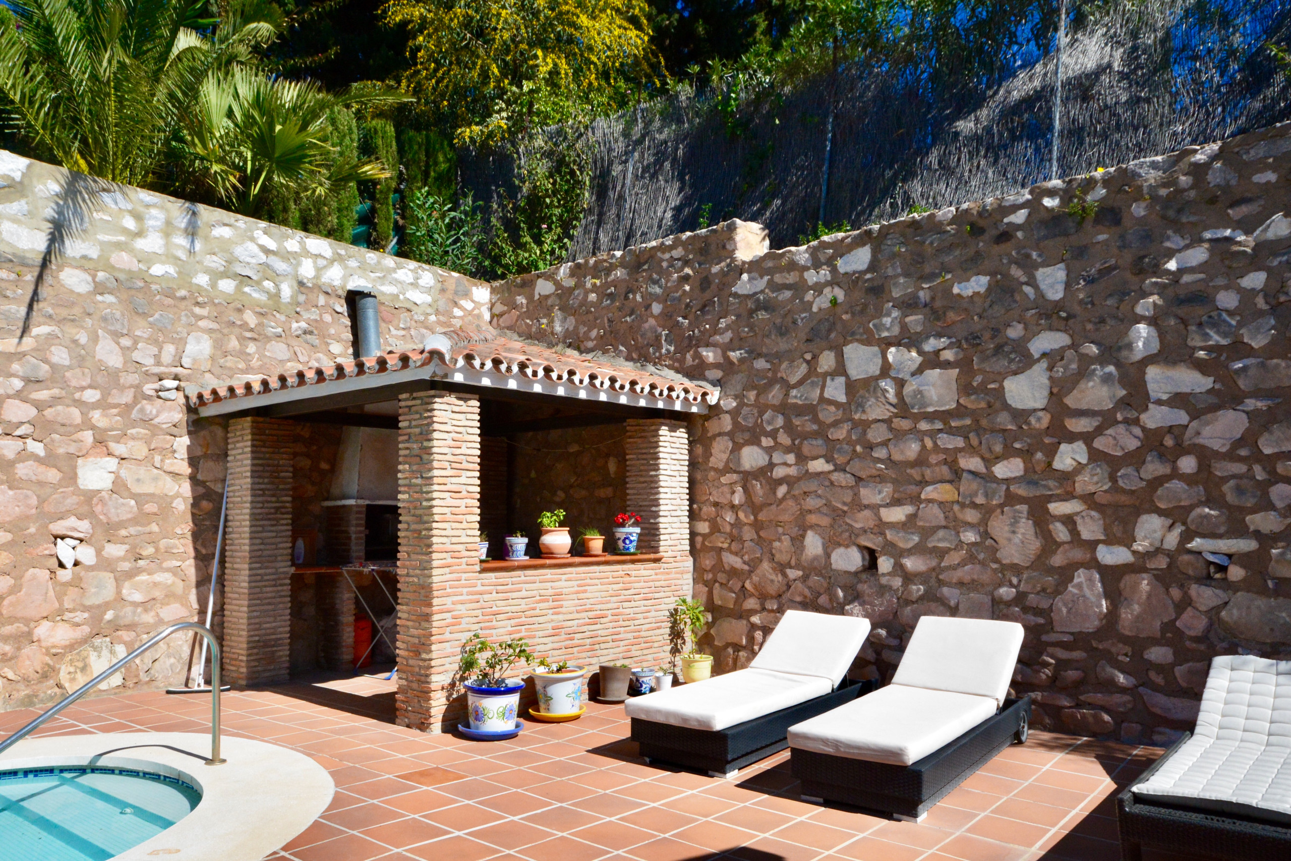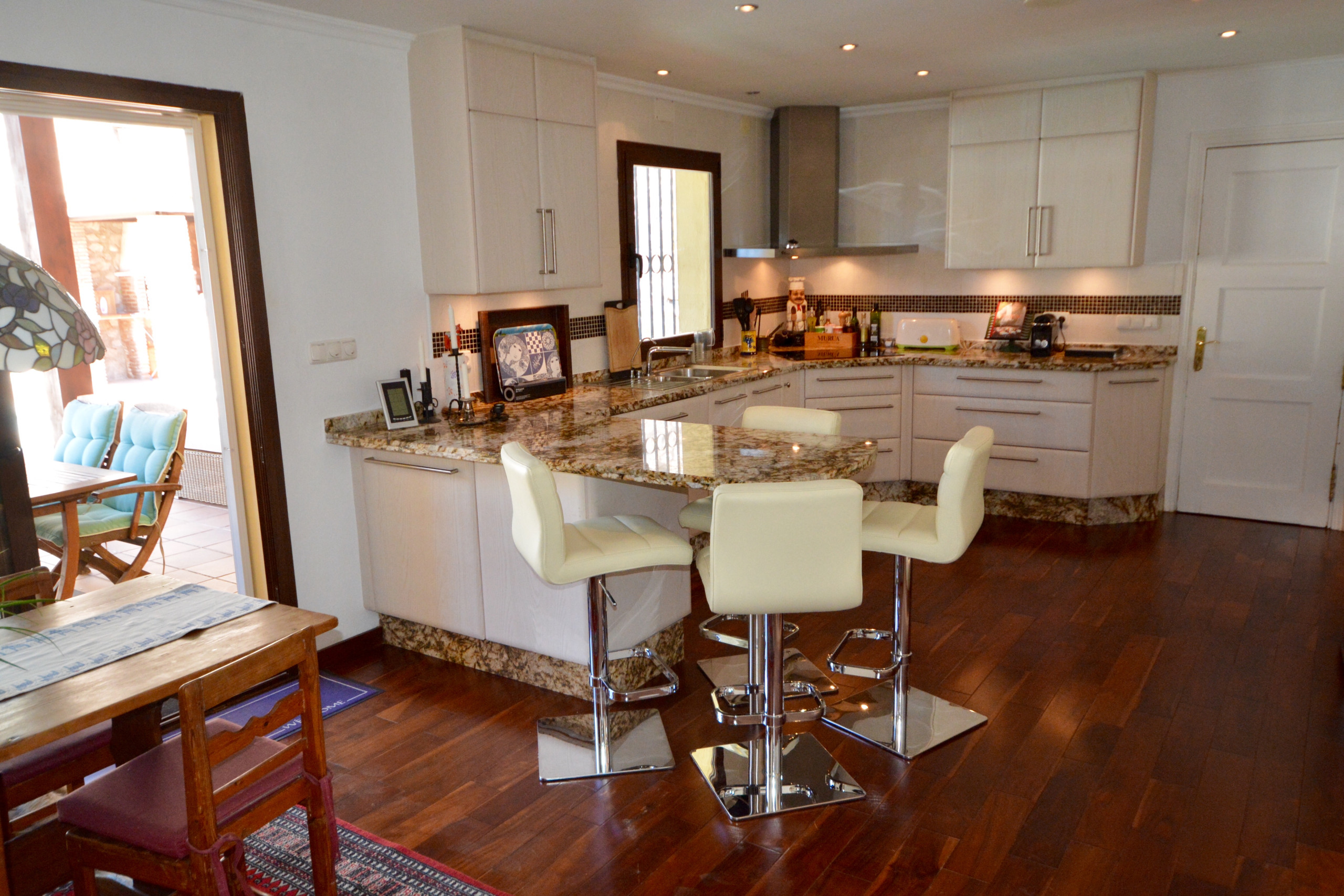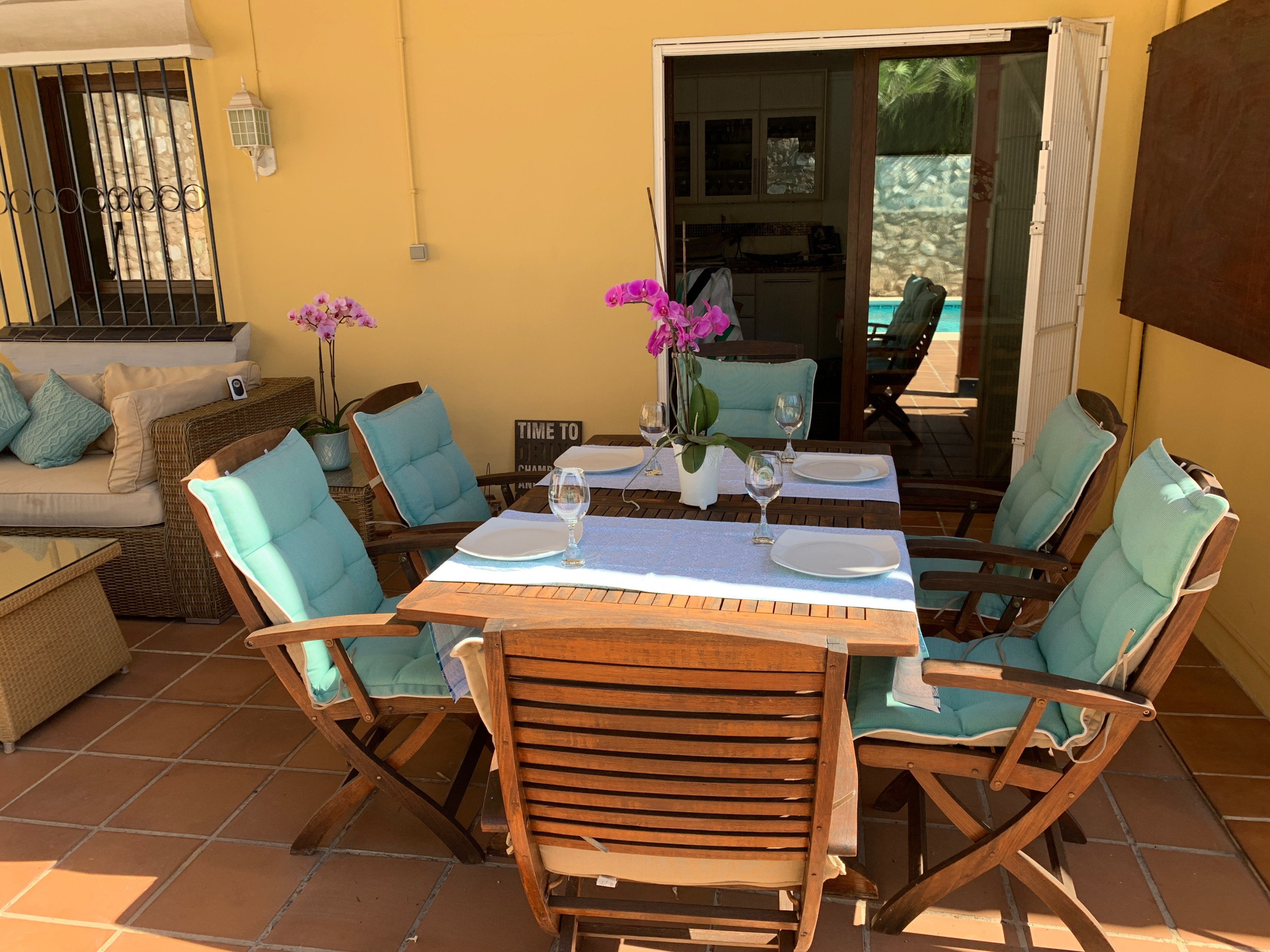 The kitchen in the villa is traditional Andalusian in style, but it is fitted with all mod cons. There is a breakfast table with seating in the kitchen, and a lovely dining room with seating for 8 and double doors out to the terrace. On the terrace there are more tables; some under a sheltered roof to provide shade if preferred. This is a lovely spot to sit and enjoy the beautiful view.