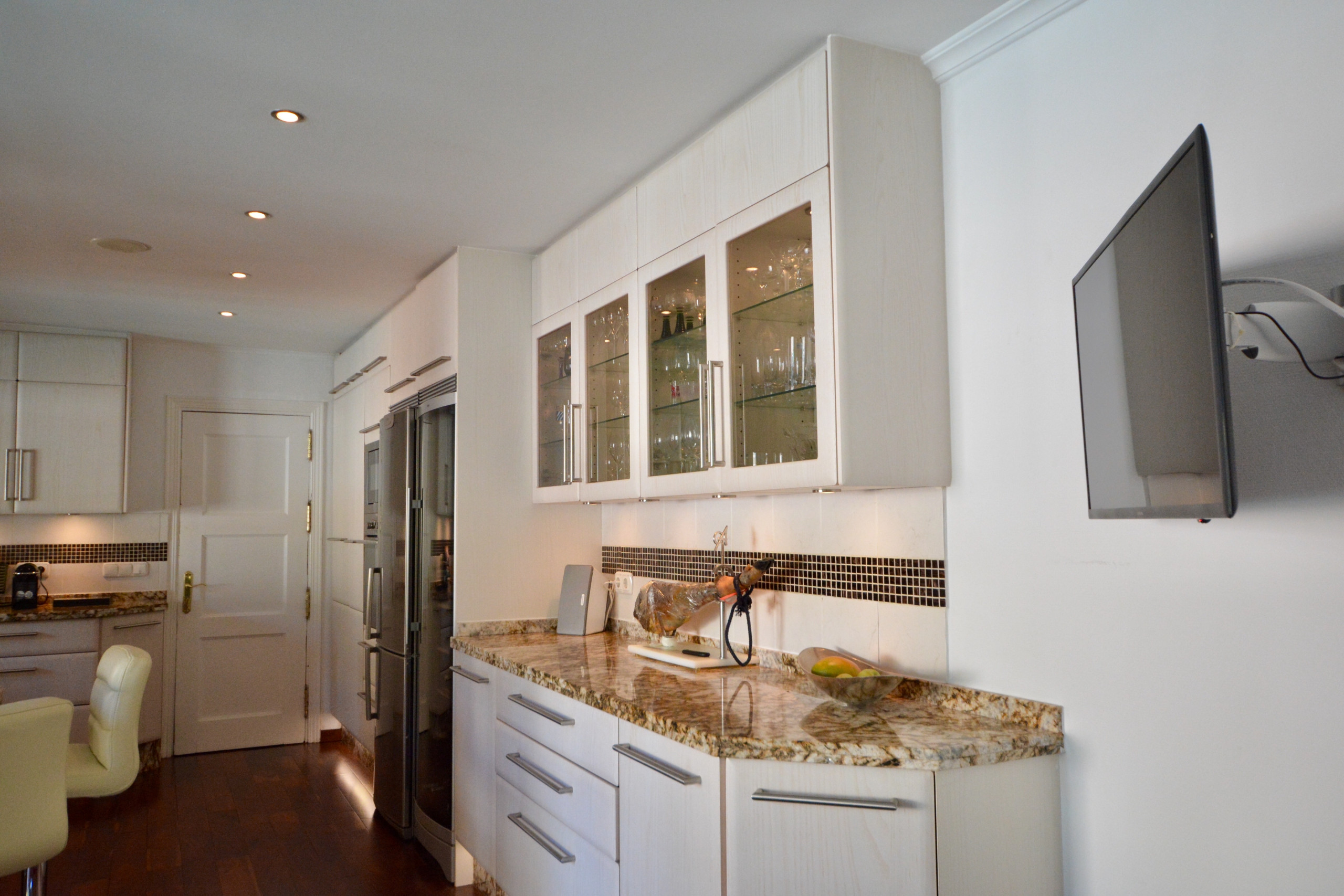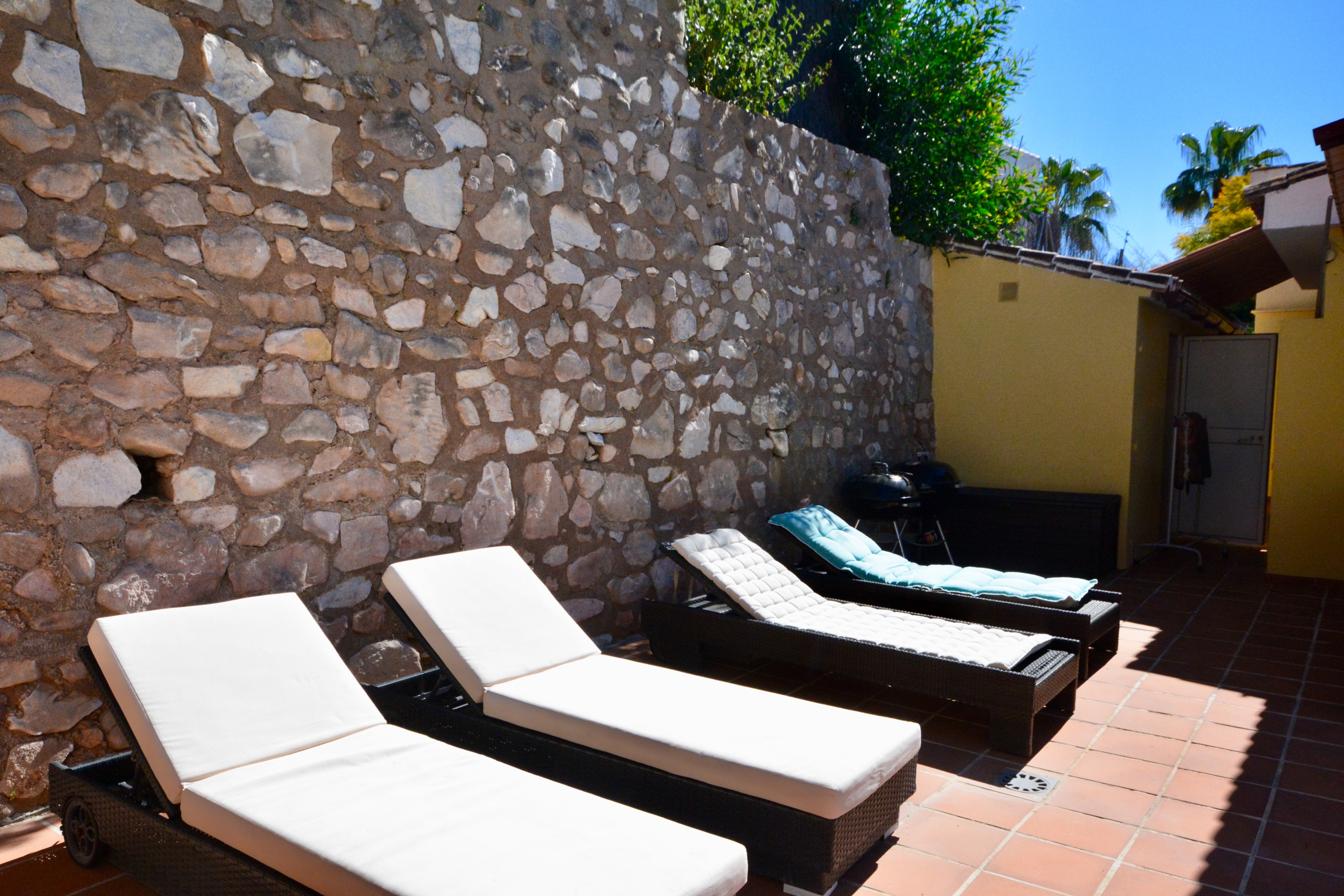 The large master bedroom has terrace access and a beautiful en-suite bathroom with corner bath and walk-in shower. Bedroom 2 is also a double room with doors onto the terrace and plenty of storage space. Both double bedrooms have TVs. Bedroom 3 is a twin room.