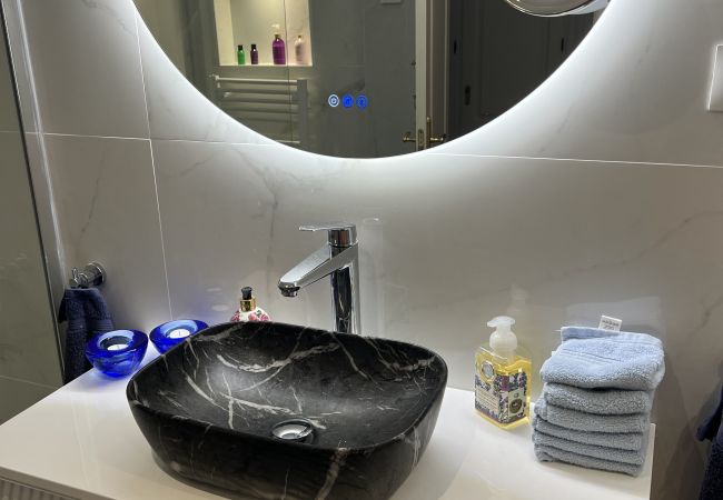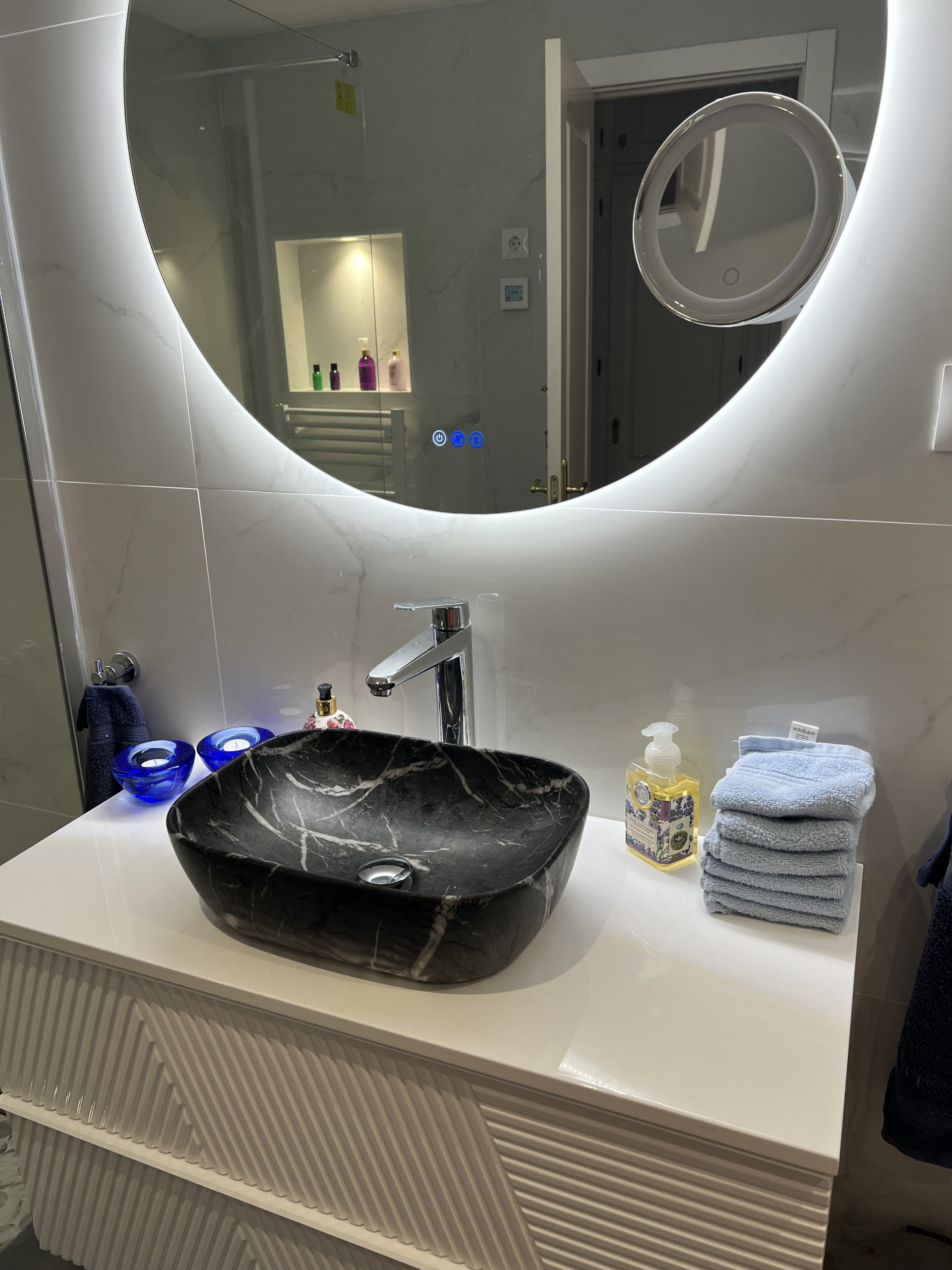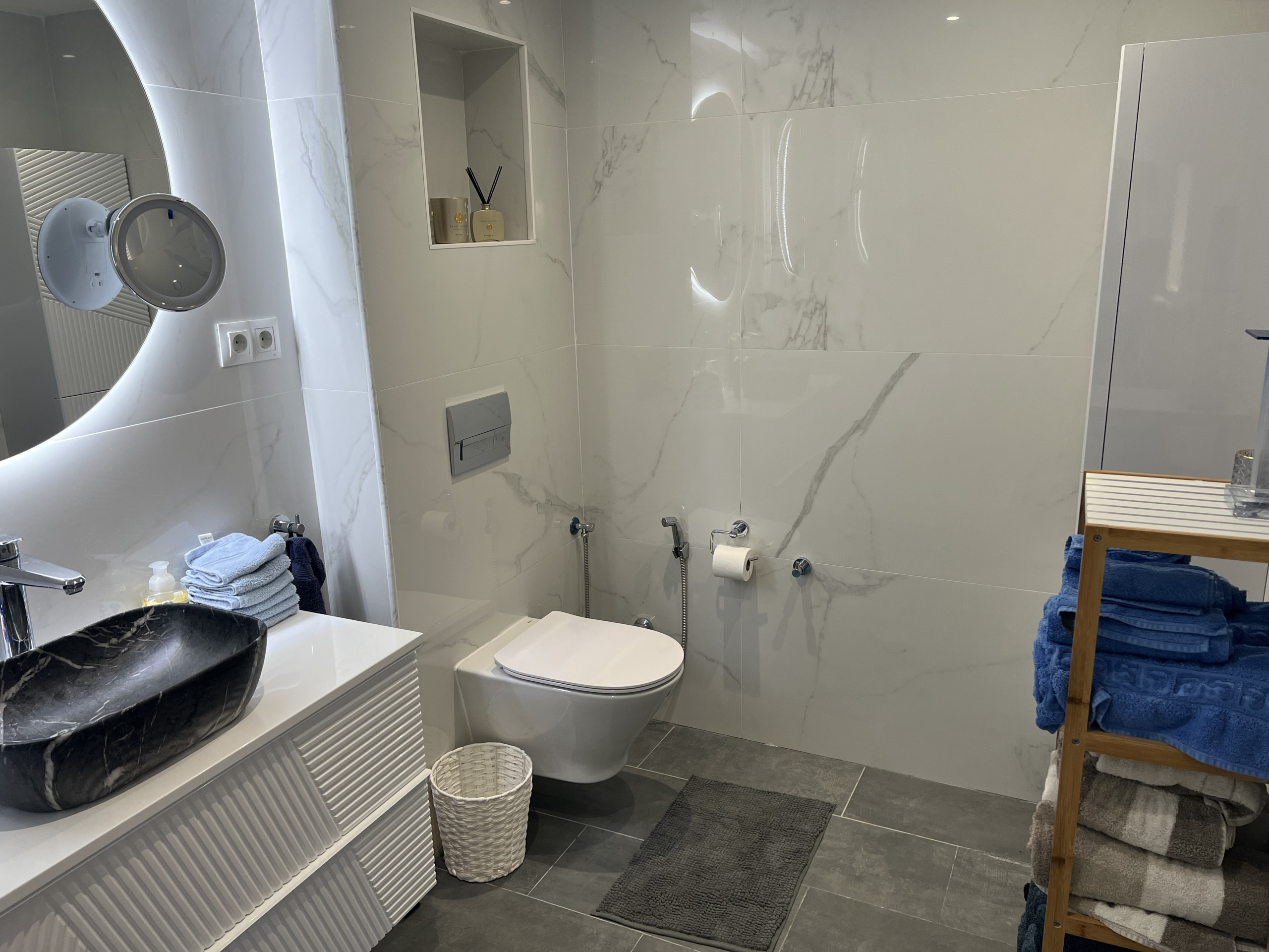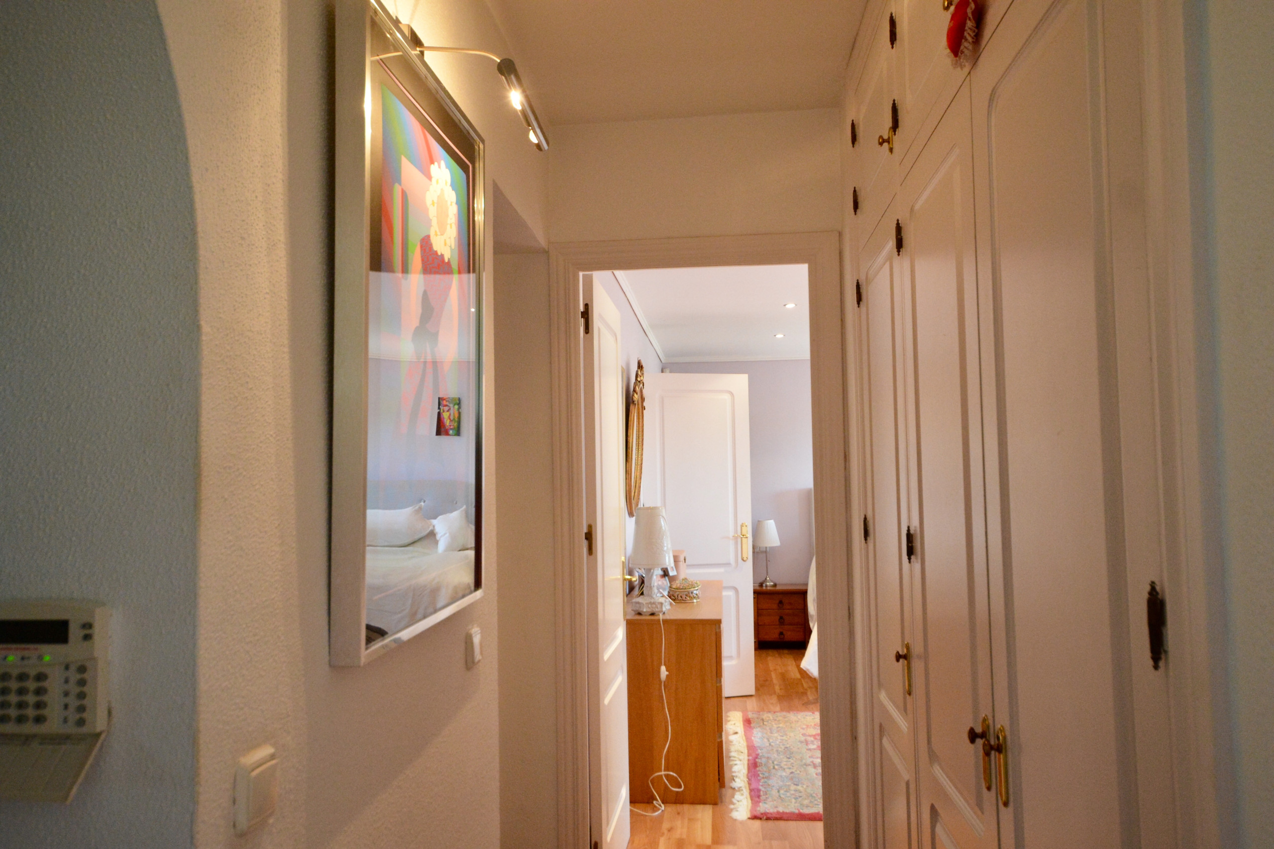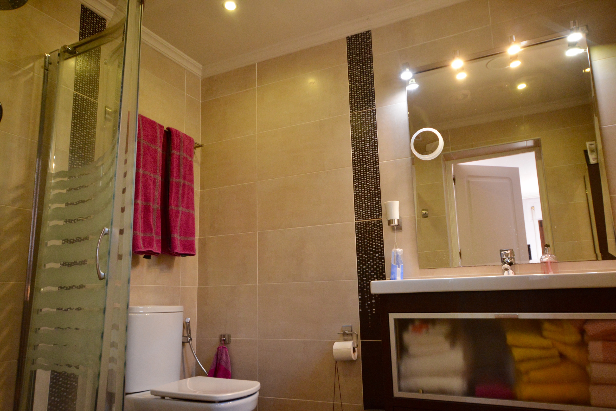 The two air conditioned sleeps on the first floor have separate balconies and double beds (one can be seperated). They share one bathroom with double washbasins, shower, wc and bidét.