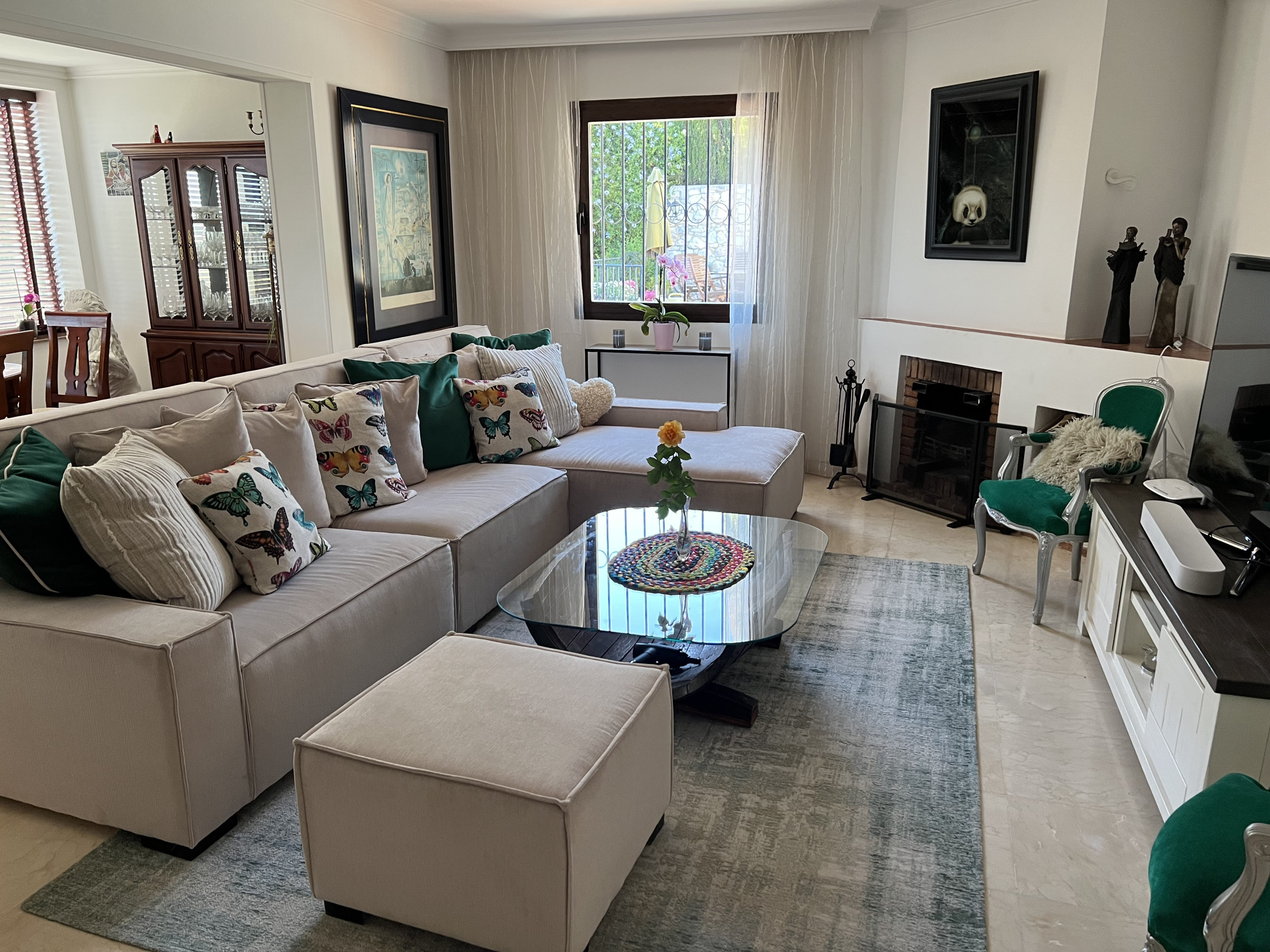 This spacious, single level villa is located on the Mijas Golf Urbanisation, just a 10 minute drive from Fuengirola and La Cala de Mijas. There are two 18 hole courses right on your doorstep at the Mijas Golf Club so this is a perfect spot for keen golfers. For those that prefer to relax by the pool this villa has large terrace furnished with outdoor sofas, table and chairs and plenty of poolside loungers.